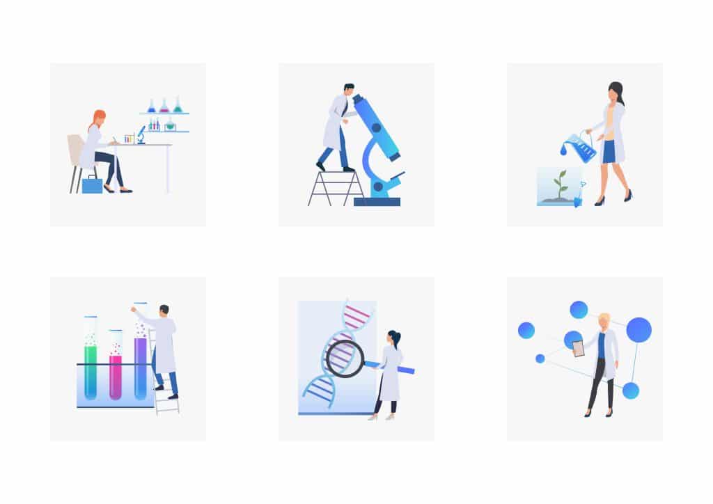 Lab research set. Scientists using microscope, test tube, watching DNA molecule. Flat vector illustrations. Science concept for banner, website design or landing web page