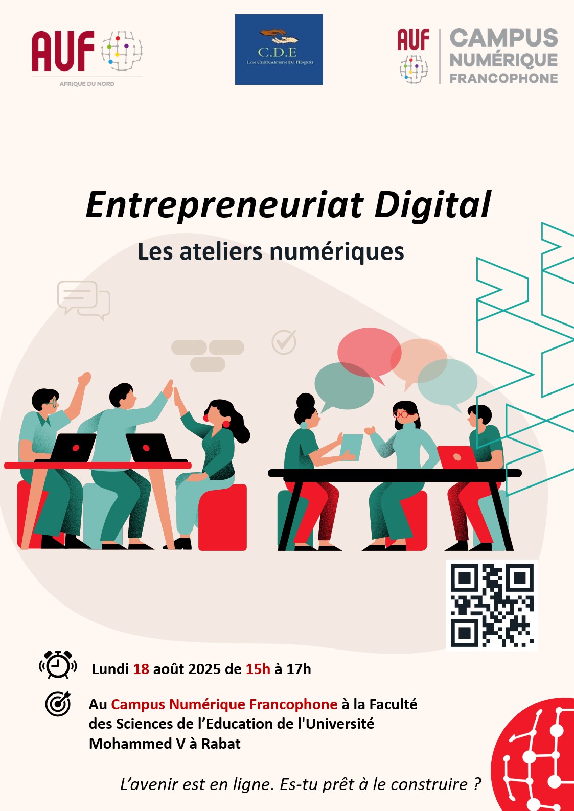 Le Campus Numérique Francophone (CNF) de Rabat de l’AUF - Afrique du Nord, en partenariat avec le Club Les Cultivateurs de l’Espoir, membre du réseau CLEF, organise un atelier sur l’entrepreneuriat digital, le lundi 18 août 2025, de 15h00 à 17h00.