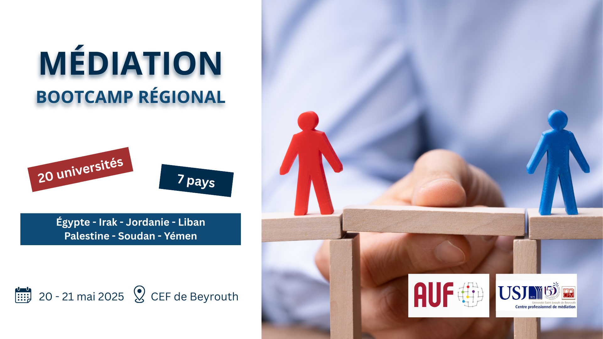 L'AUF Moyen-Orient organise, en partenariat avec le Centre professionnel de Médiation (CPM) de l'Université Saint-Joseph de Beyrouth, un bootcamp régional de médiation qui se tiendra les 20 et le 21 mai 2025, au Centre d’Employabilité Francophone (CEF) de l’AUF à Beyrouth.