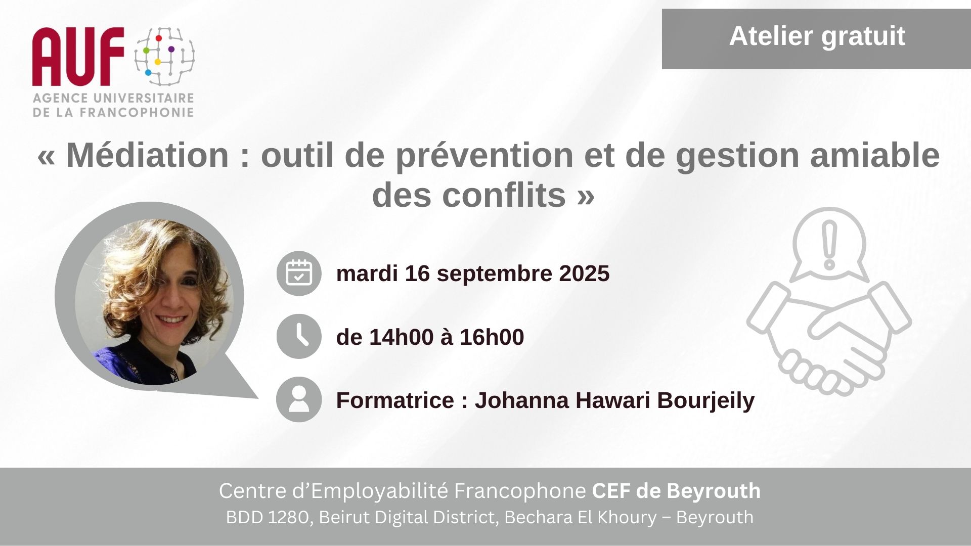 L’AUF Moyen-Orient organise une formation intitulée « Médiation : outil de prévention et de gestion amiable des conflits », qui vise les enseignants chercheurs et les étudiants, dans le cadre des activités du Centre d'Employabilité Francophone (CEF) de Beyrouth.