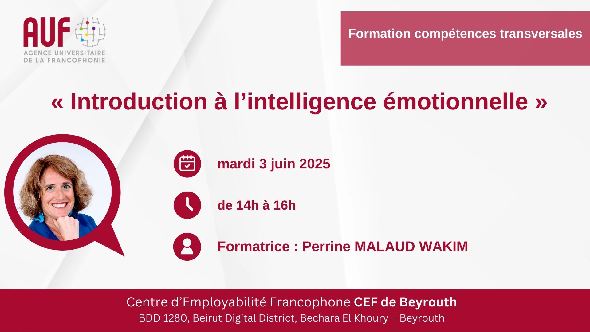 L’AUF Moyen-Orient organise une formation intitulée « introduction à l’intelligence émotionnelle », en présentiel, dans le cadre des activités du Centre d'Employabilité Francophone (CEF) de Beyrouth.