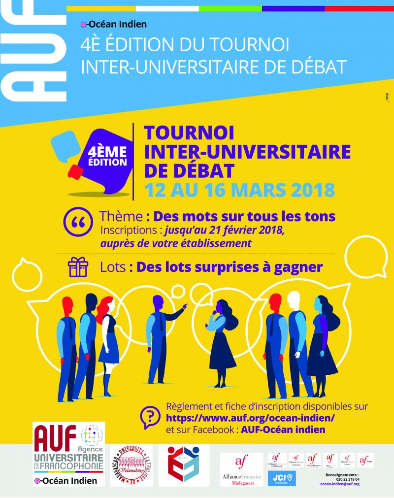 Pour célébrer la journée internationale de la Francophonie du 20 mars, l'Agence universitaire de la Francophonie, l'association des étudiants de l'INSCAE et le Club Volamahitsy de l'Université Catholique de Madagascar lance la 4è édition du concours inter-universitaire de débat du 12 au 16 mars 2018 à Antananarivo.