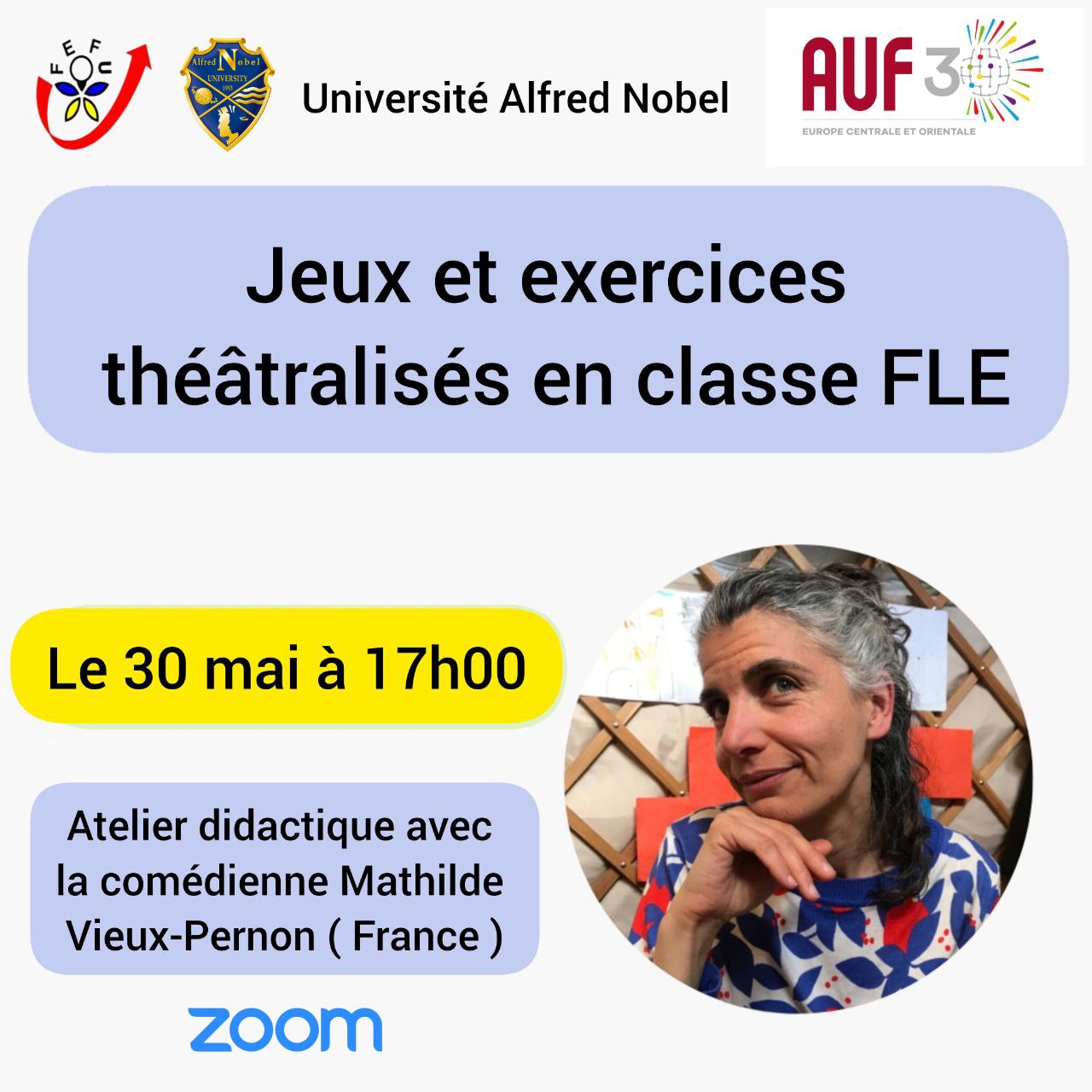 Université Alfred Nobel Centre des programmes francophones ont le plaisir de vous inviter le 30 mai 2024 à 17h00 à l’Atelier didactique « Jeux et exercices théâtralisés en classe de Français langue étrangère » avec Mme Mathilde Vieux-Pernon ( France )