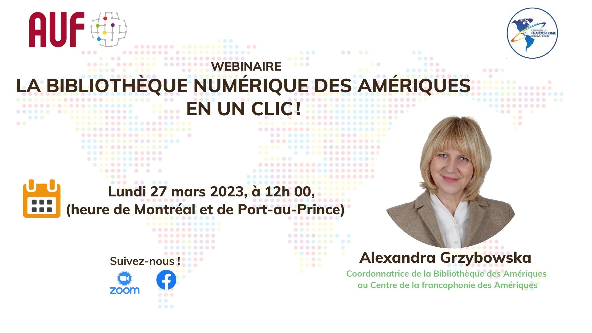 Dans le cadre de la célébration du mois de la Francophonie dans la Caraïbe et dans les Amériques, l’AUF organise, en partenariat avec le Centre de la Francophonie des Amériques, l’atelier en ligne « La bibliothèque des Amériques en un clic ! », le 27 mars, à midi (heure de Montréal et Port-au-Prince). Destiné aux enseignants de français, cet atelier vise à faire découvrir les ressources et les programmes pédagogiques de la Bibliothèque des Amériques, ainsi qu’à encourager ces derniers à intégrer les ressources de la bibliothèque en classe de français.