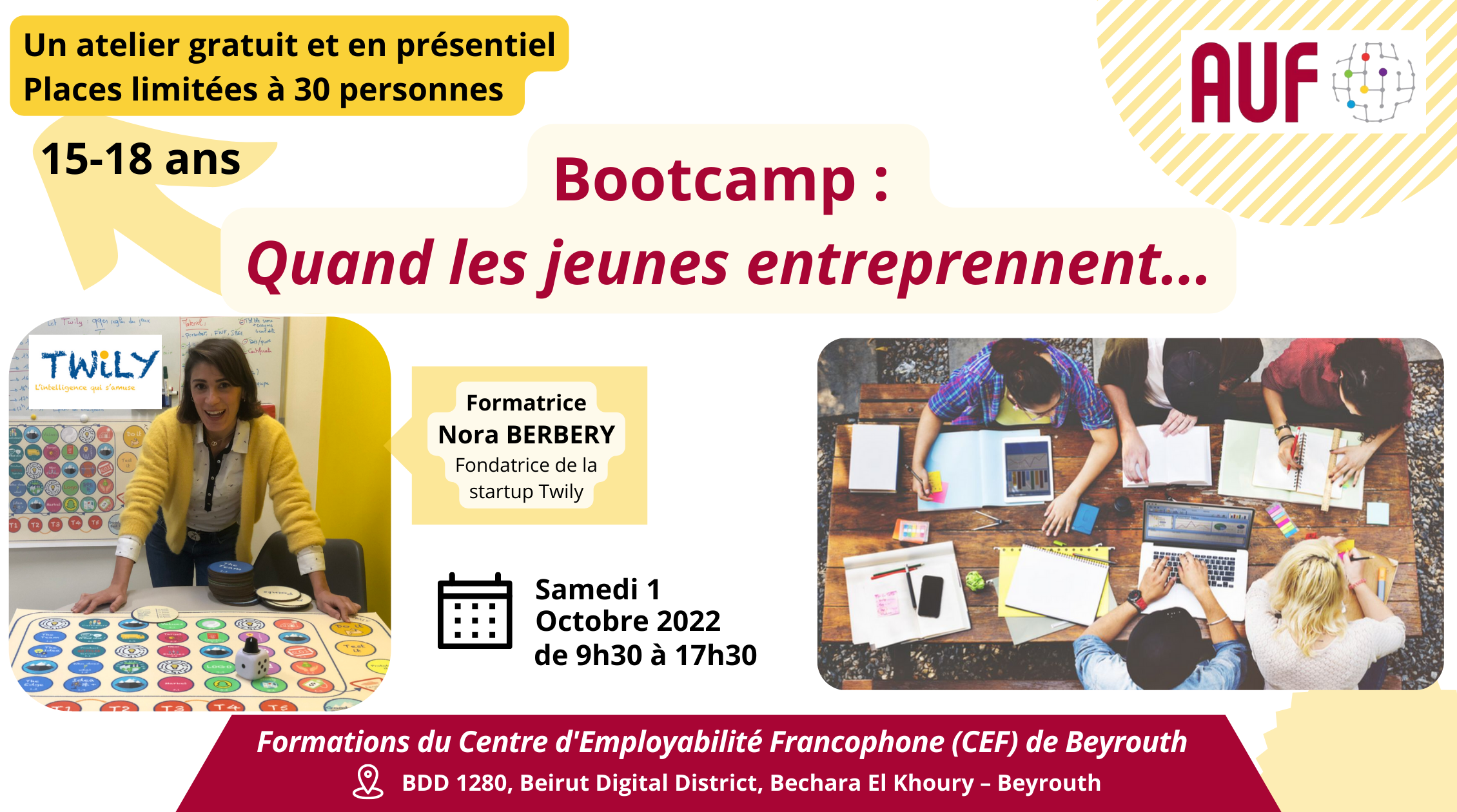 Le Centre d’Employabilité Francophone (CEF) de Beyrouth de l’AUF organise un bootcamp pour les jeunes de 15 à 18 ans intitulé « Quand les jeunes entreprennent », le 1er octobre 2022, de 9h30 à 17h30. Les places sont limitées à 30 personnes.