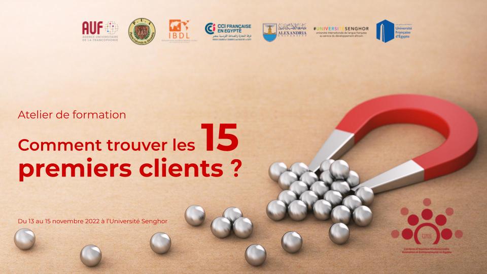 Dans le cadre du projet CIPIEE (Carrières et insertion professionnelle innovation et entrepreneuriat en Égypte) mené conjointement par l’AUF Moyen-Orient et l’Université Senghor, un atelier de formation intitulé : "Comment trouver les 15 premiers clients ?" se tiendra du 13 au 15 novembre 2022, et sera animé par M. Amine Matthieu Borel.