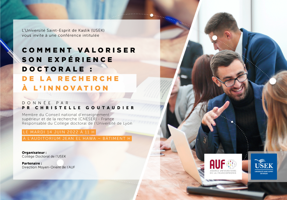 L'Université Saint-Esprit de Kaslik organise, avec le soutien de l'AUF Moyen-Orient, une rencontre qui vise à donner une vue d’ensemble des défis de la formation doctorale, avec le Pr Christelle GOUTAUDIER, membre du Conseil National de l’Enseignement Supérieur et de la Recherche (CNESER)-France et responsable du Collège doctoral de l’Université de Lyon.