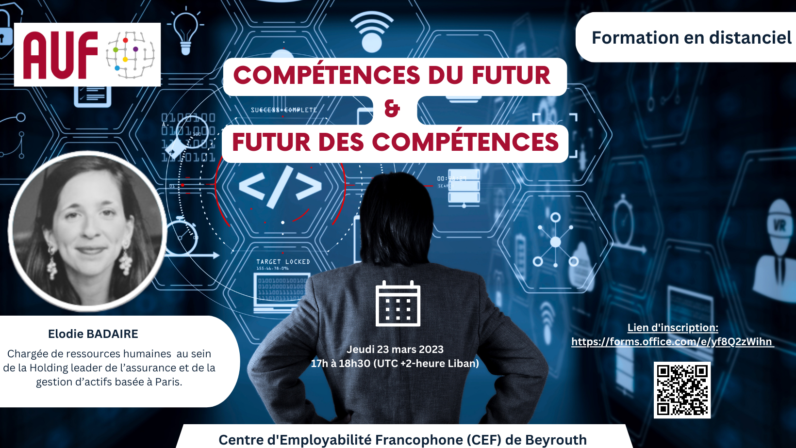 Le Centre d’Employabilité Francophone (CEF) de Beyrouth de l’AUF organise une formation en distanciel intitulée « Compétences du futur et futur des compétences », le 23 mars 2023, de 17h00 à 18h30 (UTC+2, heure de Beyrouth).