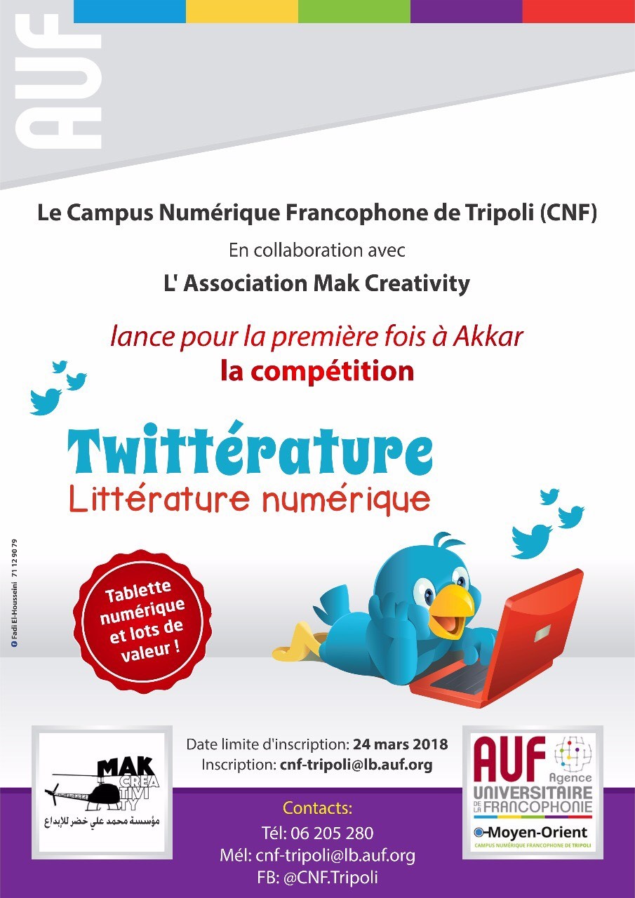 Le Campus Numérique Francophone de l’AUF à Tripoli et l’association « MAK for creativity » organisent le concours « Twittérature : Littérature numérique » qui met à l’honneur les talents d’écriture des lycéens francophones du village de Berkayel et de son voisinage dans la région du Akkar.