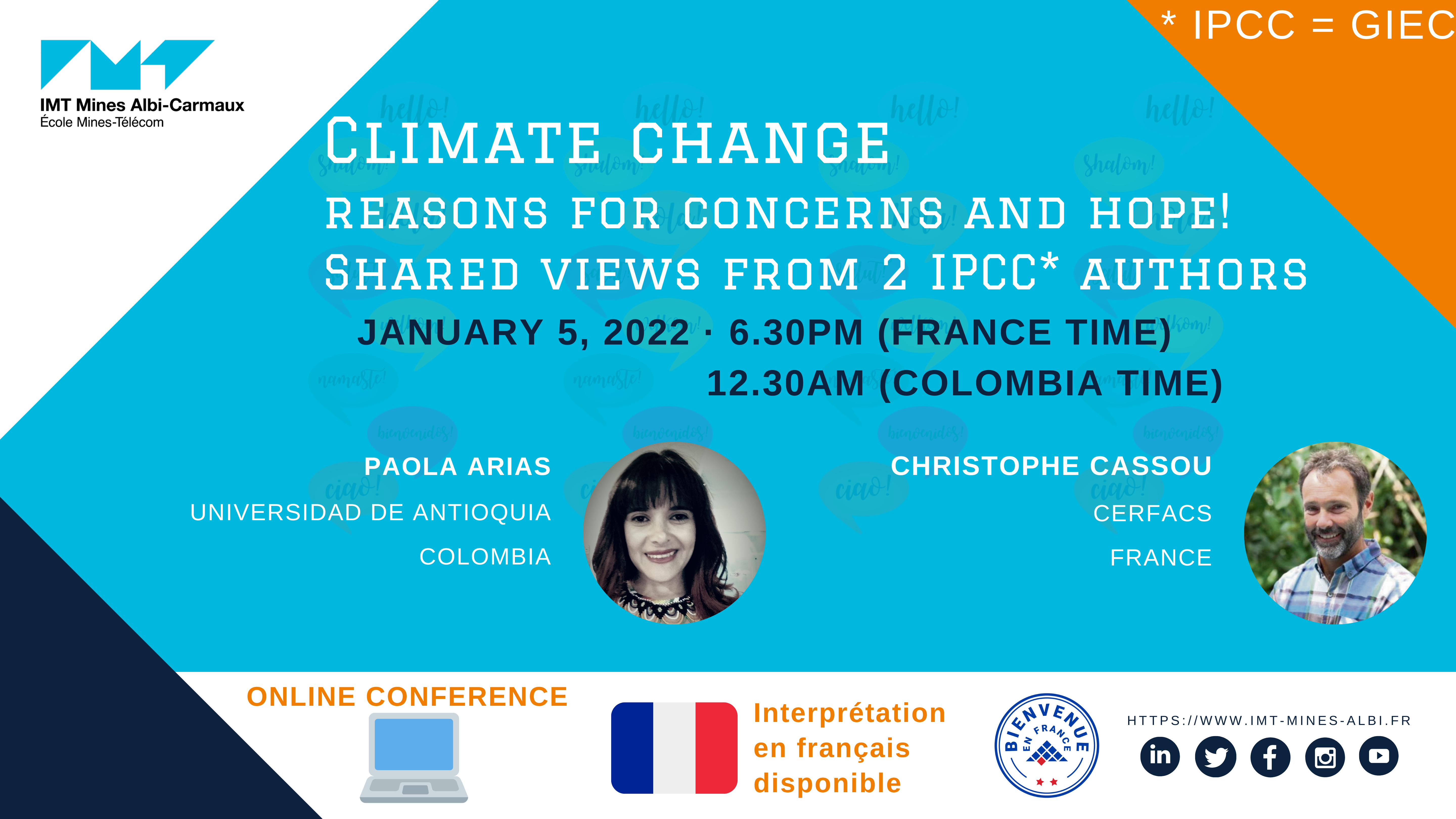 L'IMT Mines Albi organise en ligne, le 5 janvier 2022 à 18h30 (h de Paris,) une conférence intitulée "Changement climatique : inquiétudes et espoir. Deux experts du GIEC en débattent avec nous."/"Climate change: reasons for concerns and hope" qui réunira les visions de deux auteurs du rapport spécial du Groupe d'experts Intergouvernemental sur l’Évolution du Climat 2021 (GIEC).