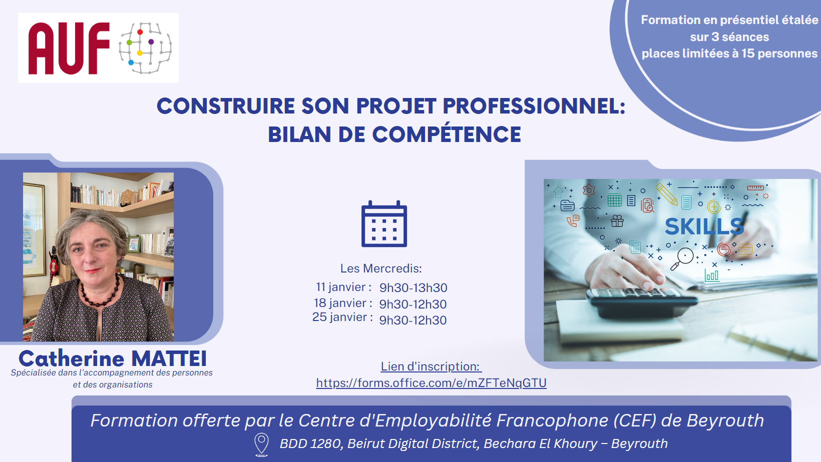 Le Centre d’Employabilité Francophone (CEF) de Beyrouth de l’AUF organise trois ateliers de formation intitulés « Construire son projet professionnel : bilan de compétence », les 11, 18 et 25 janvier 2023, de 9h30 à 13h30.