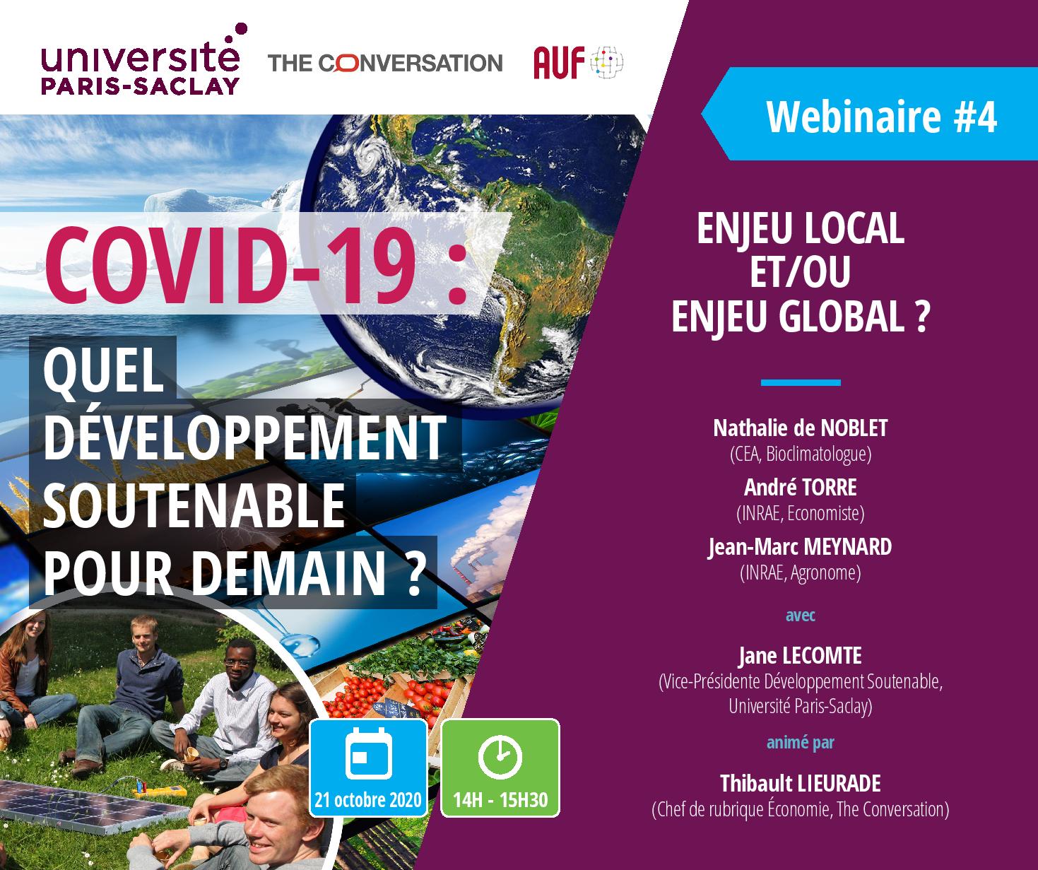 Dans le cadre de la mobilisation actuelle et des réflexions collectives que suscite la pandémie de Covid-19, une série de webinaires sur le développement soutenable organisés par l’Université Paris-Saclay donneront la parole aux experts de l’Université. Mis en place en collaboration avec le média en ligne The Conversation et l’Agence universitaire de la Francophonie, ces webinaires auront pour but de croiser les disciplines et les regards, de manière à éclairer les différents aspects de cette crise sanitaire à l’aune des enjeux environnementaux.