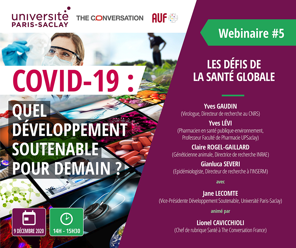Dans le cadre de la mobilisation actuelle et des réflexions collectives que suscite la pandémie de Covid-19, une série de webinaires sur le développement soutenable organisés par l’Université Paris-Saclay donnent la parole aux experts de l’Université. Mis en place en collaboration avec le média en ligne The Conversation et l’Agence universitaire de la Francophonie, ces webinaires ont pour but de croiser les disciplines et les regards, de manière à éclairer les différents aspects de cette crise sanitaire à l’aune des enjeux environnementaux.