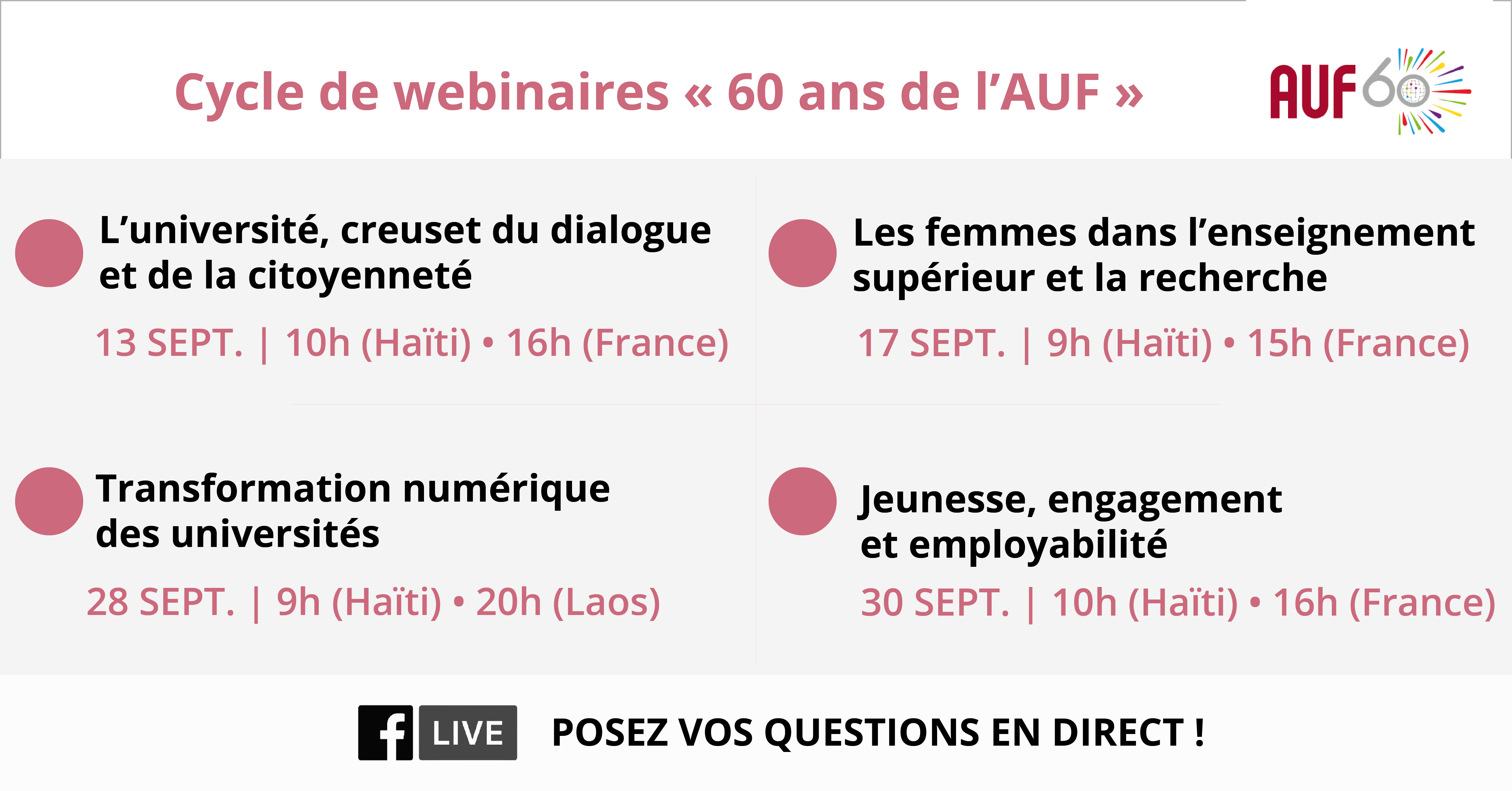 Dans le cadre de la commémoration des 60 ans de l’Agence universitaire de la Francophonie (AUF), la Direction régionale Caraïbe a proposé ce cycle de webinaires articulé autour de l’actualité scientifique francophone. La totalité des activités est réalisée en visioconférence.
