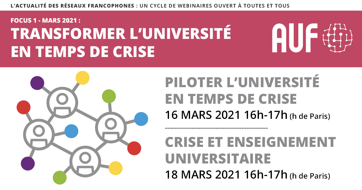 L’AUF lance en mars 2021 un nouveau cycle de webinaires ouvert à tout public : "L'actualité des réseaux francophones". Organisé en partenariat avec le média The Conversation France, ce cycle de webinaires s’articulera autour de l’actualité scientifique francophone tout en restant accessible au grand public. Les réseaux de l’AUF seront partenaires et acteurs du cycle. Le focus 1 de ce cycle "Transformer l’Université en temps de crise " est composé de 2 webinaires qui se dérouleront le 16 et le 18 mars 2021.