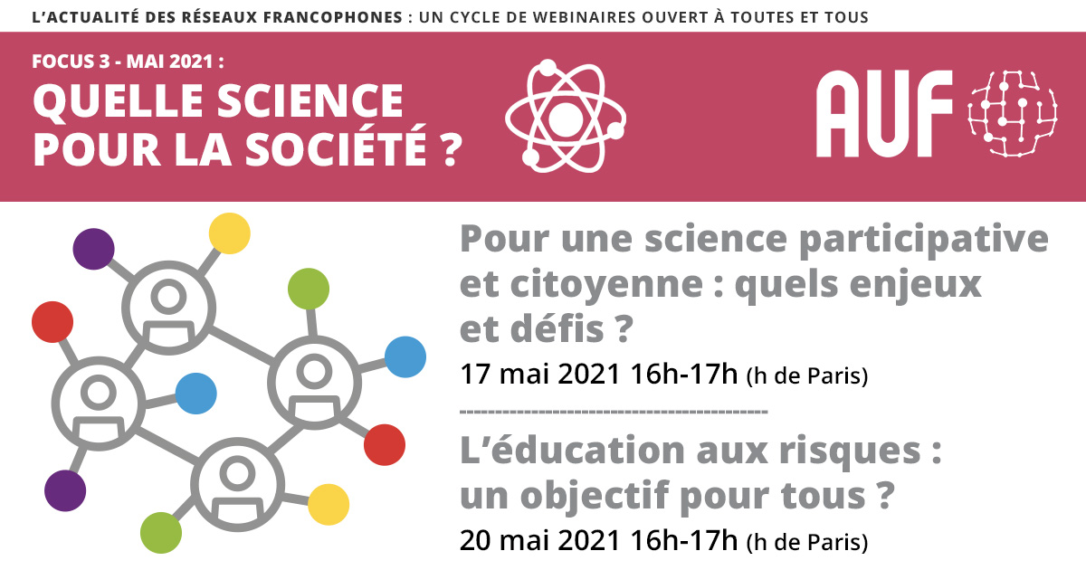 L’AUF a lancé en mars 2021 un nouveau cycle de webinaires ouvert à tout public : "L'actualité des réseaux francophones". Organisé en partenariat avec le média The Conversation France, ce cycle de webinaires s’articulera autour de l’actualité scientifique francophone tout en restant accessible au grand public. Les réseaux de l’AUF seront partenaires et acteurs du cycle. Le Focus 3 de ce cycle " Quelle science pour la société ?" est composé de 2 webinaires qui se tiendront les 17 et 20 mai 2021.