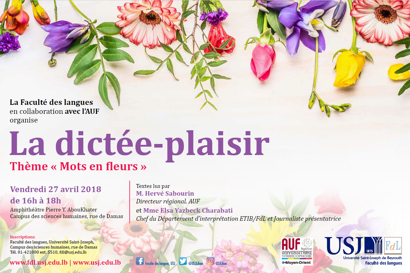 La Faculté des langues de l'Université Saint-Joseph (USJ), en collaboration avec l’AUF au Moyen-Orient, organise une dictée-plaisir sur le thème « Mots en fleurs » le vendredi 27 avril 2018 de 16h à 18h à l'Amphithéâtre Pierre Y. Abou Khater du Campus des sciences humaines de l'Université Saint-Joseph.