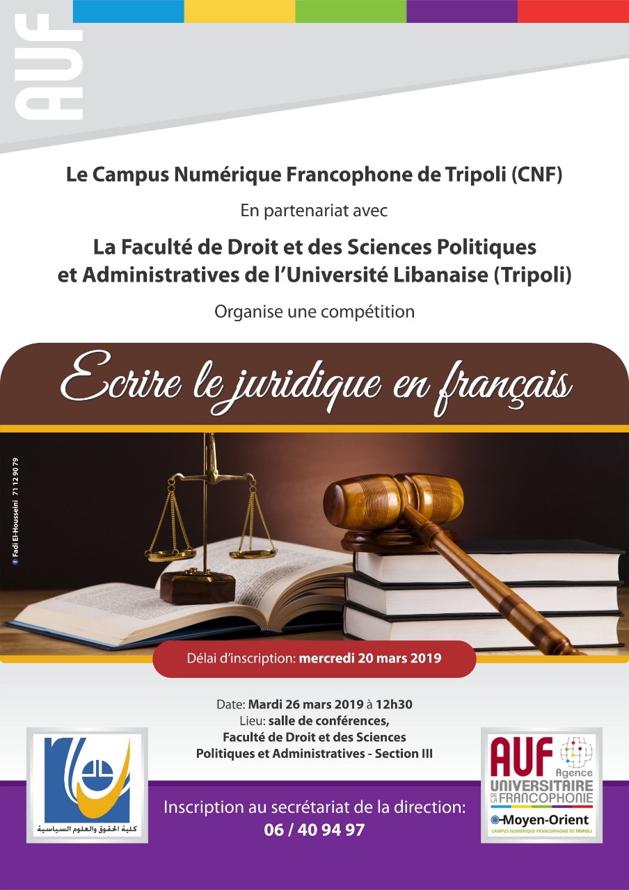 En partenariat avec la Faculté de Droit et des sciences politiques et administratives de l'Université Libanaise, le Campus Numérique Francophone de Tripoli organise une compétition sous le thème « Écrire le juridique en français », le mardi 26 mars 2019 à 12h30, à la Faculté de droit et de sciences politiques et administratives de l'Université Libanaise, section 3, Tripoli .