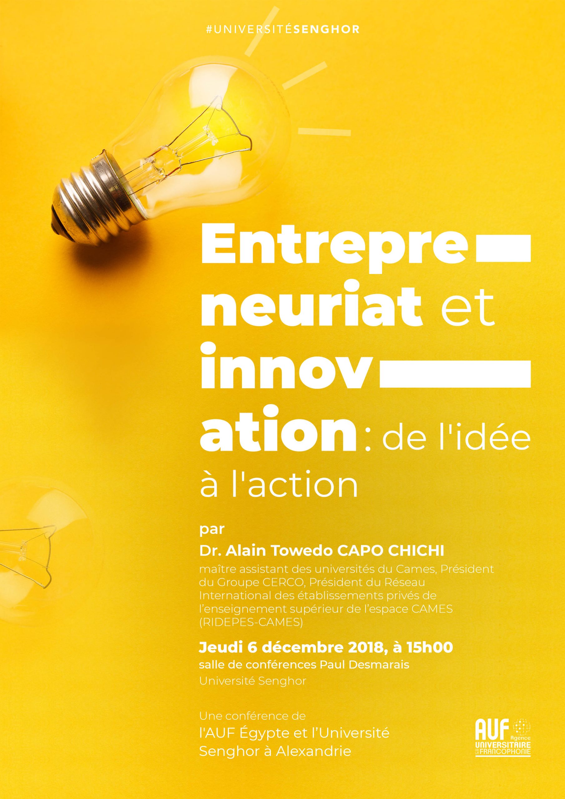 Dans le cadre du projet « Centre pour l’insertion professionnelle, l’innovation et l’entrepreneuriat en Égypte » (CIPIEE), l’AUF, en partenariat avec l'Université Senghor, organise une conférence sur le thème « Entrepreneuriat et innovation: de l'idée à l'action », animée par Dr. Alain Towedo CAPO CHICHI, le jeudi 6 décembre, de 15h00 à 17h00, à l'Université Senghor, salle de conférence, 9ème étage.