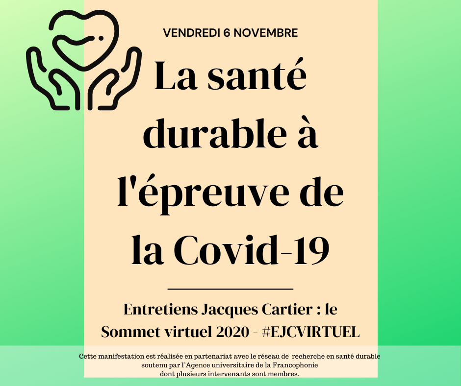 Dans le cadre du Sommet 2020 virtuel des Entretiens Jacques Cartier, vous êtes invités à assister à la Conférence " La santé durable à l'épreuve de la COVID-19 qui aura lieu le 6 novembre 2020.