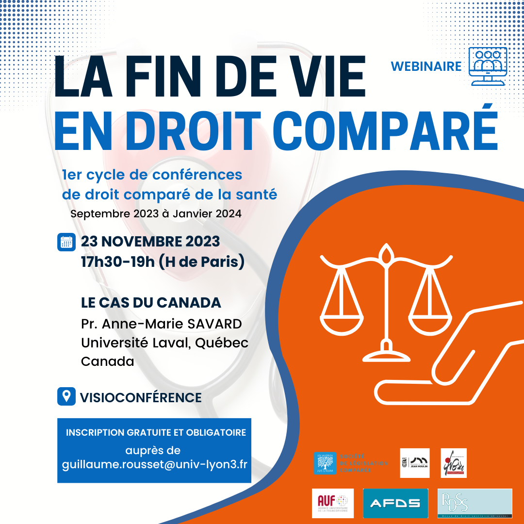 La fin de vie en droit comparé - 1er cycle de conférences de droit comparé de la santé en visioconférence intégrale - est organisé de septembre 2023 à janvier 2024, sous la direction de Guillaume Rousset, Maître de conférences en Droit, HDR, Université Jean Moulin Lyon 3 (CRDMS/IFROSS), directeur du CRDMS et par la Société de Législation Comparée et l’Université Jean Moulin Lyon 3 (CRDMS/IFROSS) en partenariat avec l’Association Française de Droit de la Santé (AFDS), l’Agence Universitaire de la Francophonie (AUF) et la Revue de Droit Sanitaire et Social.