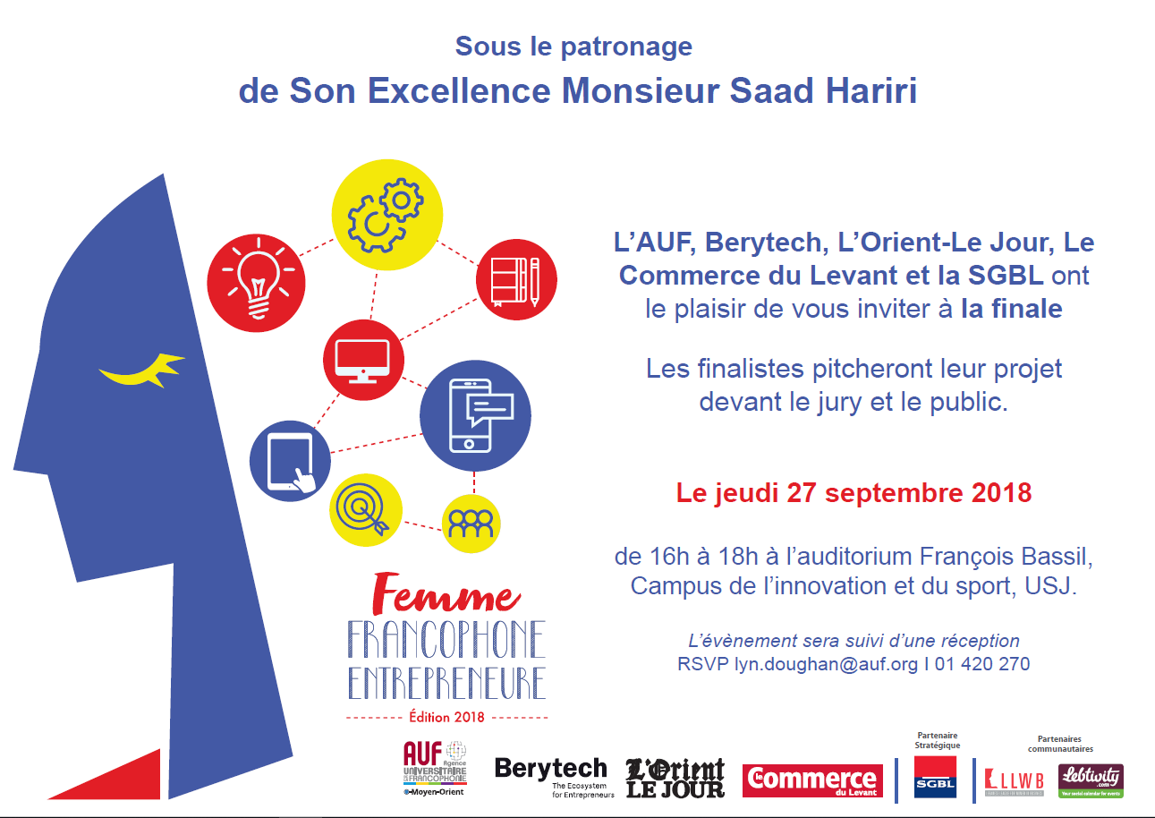 Sous le patronage du Premier Ministre libanais M. Saad Hariri, l’AUF, Berytech, L’Orient-Le Jour, Le Commerce du Levant et la SGBL organisent la finale du concours «Femme Francophone Entrepreneure 2018», le jeudi 27 septembre 2018, de 16h à 18h, à l’auditorium François Bassil, Campus de l’innovation et du sport, Université Saint-Joseph.