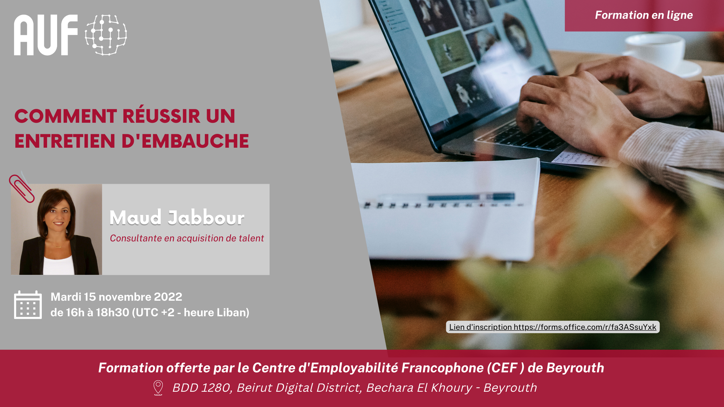 Le Centre d’Employabilité Francophone (CEF) de Beyrouth de l’AUF, organise une formation intitulée « Comment réussir un entretien d’embauche », le 15 novembre, de 16h00 à 18h30, en ligne.