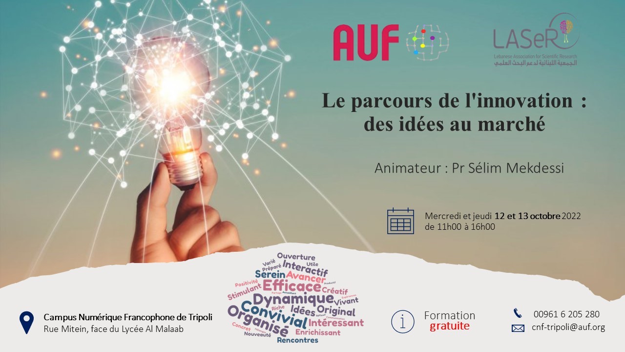 Le Campus Numérique Francophone de Tripoli de l'AUF organise, en collaboration avec l’association Laser, une formation intitulée « Le parcours de l’innovation : des idées au marché ».