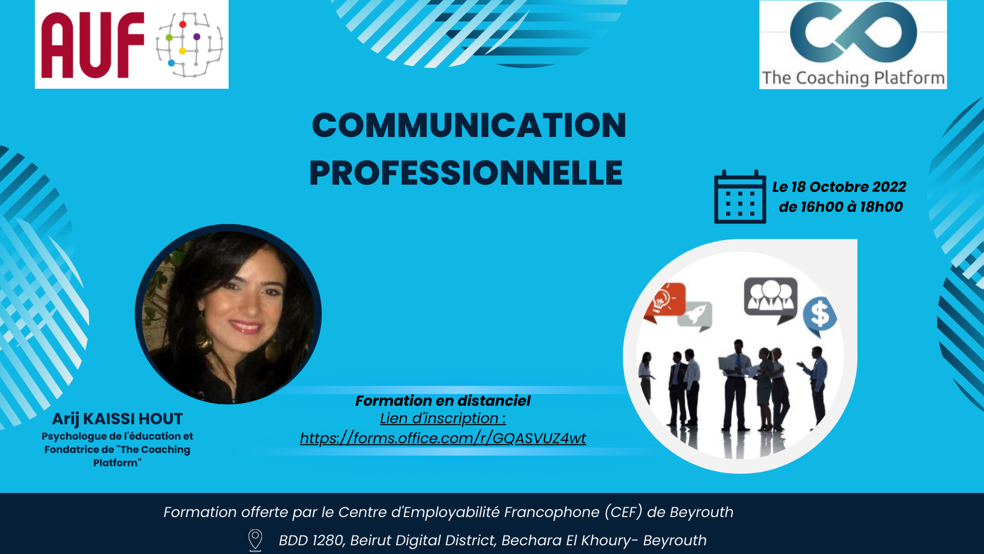 Le Centre d’Employabilité Francophone de Beyrouth (CEF) de l’AUF, organise un atelier de formation en distanciel sur la « Communication professionnelle » , mardi 18 octobre 2022, de 16h00 à 18h00 (fuseau horaire : Asie/Beyrouth).