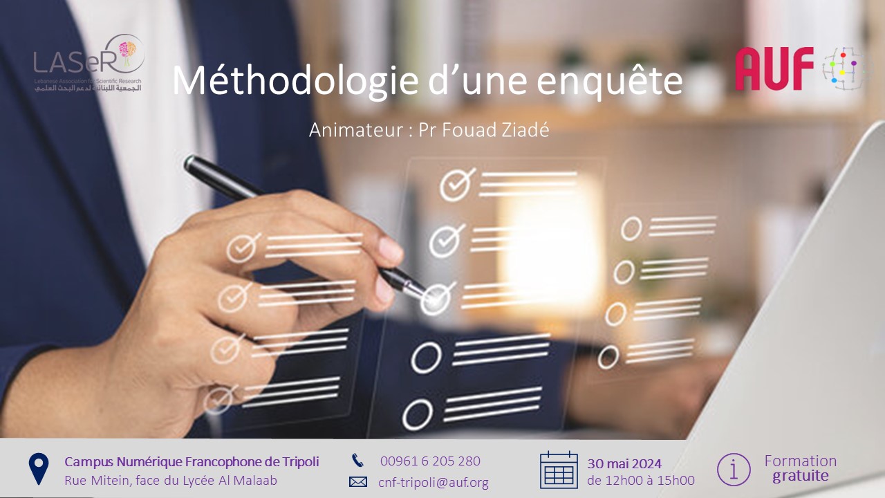 Le Campus Numérique Francophone de Tripoli de l'AUF organise, en collaboration avec l’association LASeR, une formation intitulée « Méthodologie d’une enquête de recherche scientifique ».