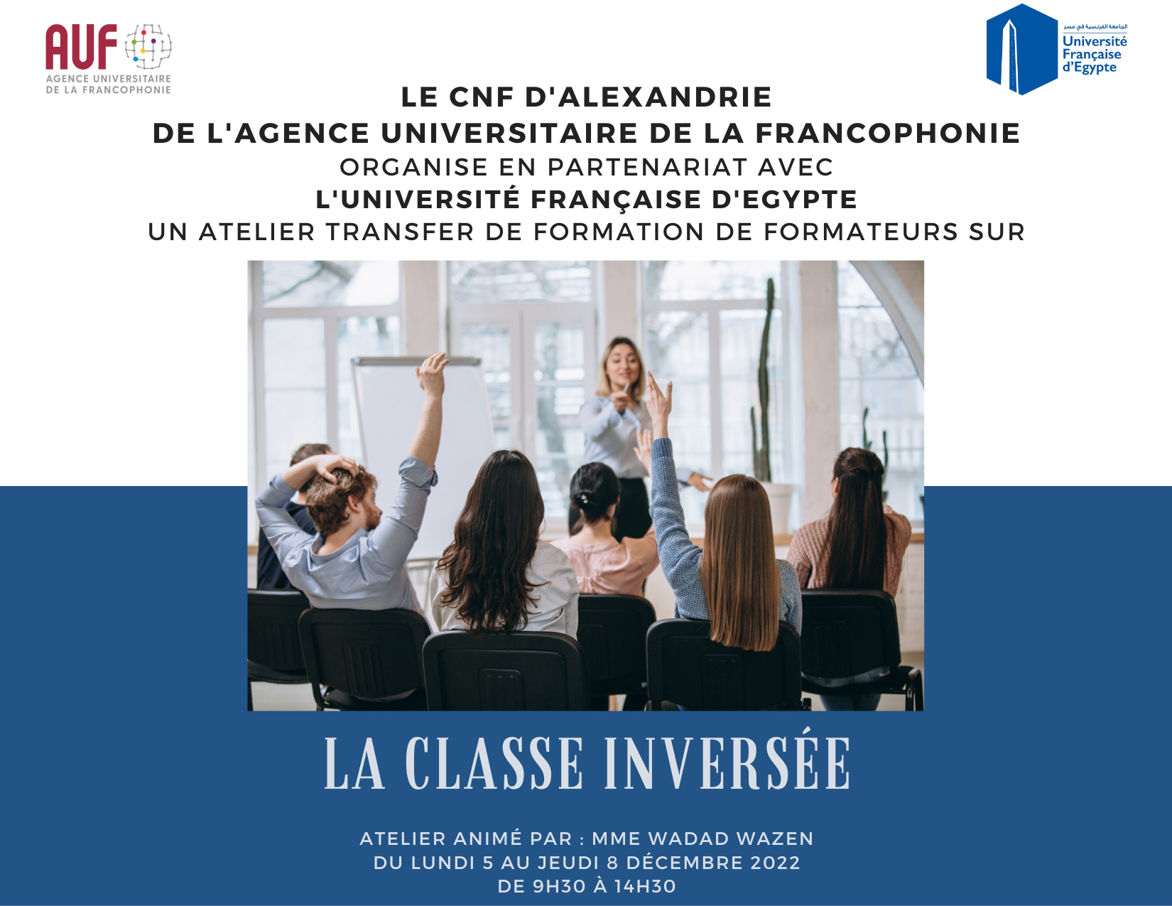 Dans le cadre des ateliers de formation TRANSFER prévus par le Campus Numérique Francophone (CNF) d'Alexandrie, un atelier auprès des enseignants de l'Université Française d’Égypte (UFE) au Caire est prévue du 5 au 8 décembre 2022, avec pour thème la classe inversée.