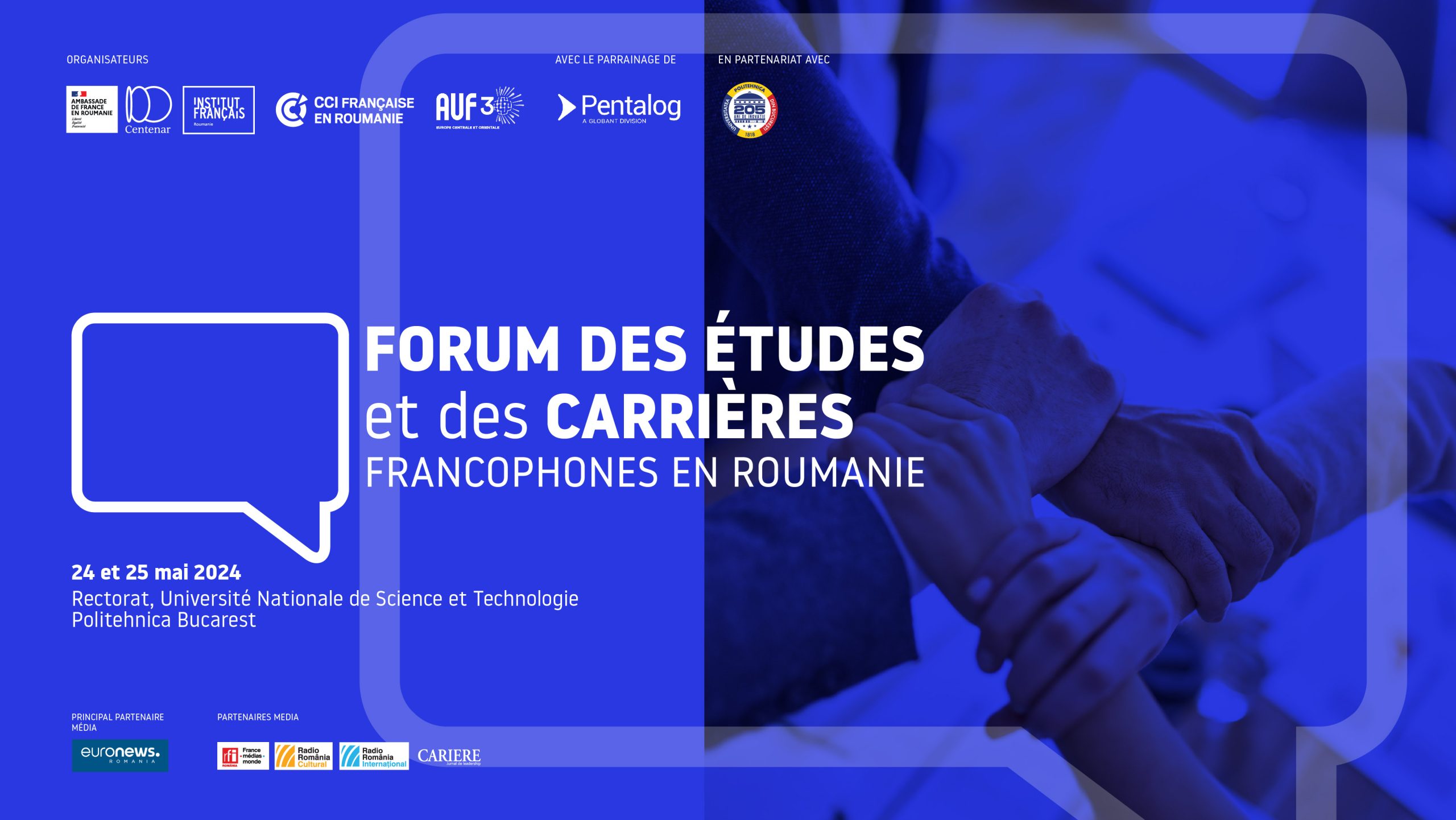 L’Ambassade de France/l’Institut français en Roumanie, la Chambre Française de Commerce et d’Industrie en Roumanie (CCIFER) et l’Agence Universitaire de la Francophonie, en partenariat avec l'Université Nationale de Science et Technologie Politehnica Bucarest organisent les 24 et 25 mai 2024 la 2ème édition du Forum des études et des carrières francophones en Roumanie.