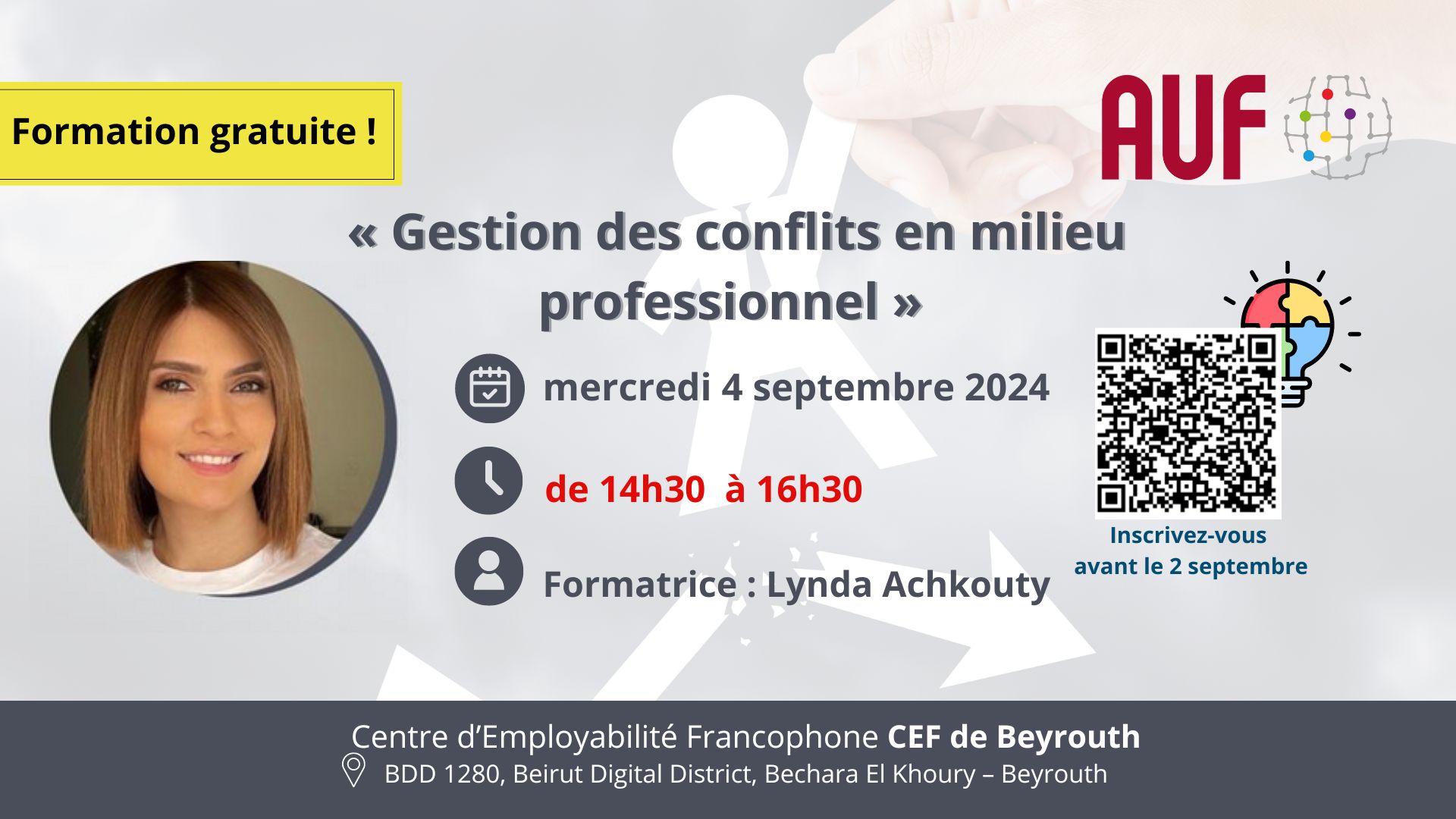 L’AUF Moyen-Orient organise une formation intitulée « Gestion des conflits en milieu professionnel », au Centre d'Employabilité Francophone (CEF) de Beyrouth.