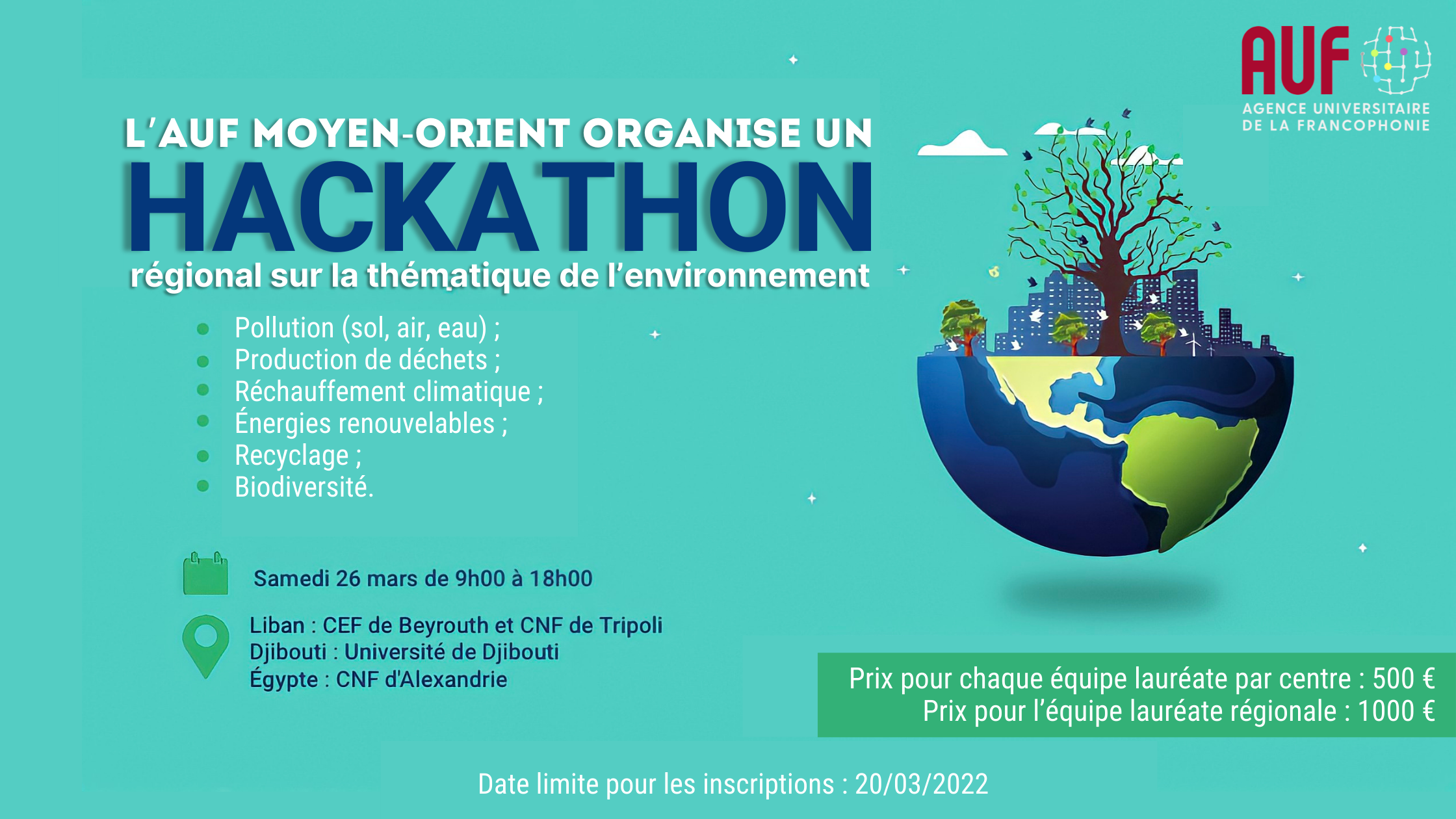 A l’occasion du mois de la francophonie, l’AUF Moyen-Orient organise un Hackathon régional sur la thématique de l’environnement le samedi 26 mars 2022 de 9h00 à 18h00. Ce hackathon sera organisé en même temps au CEF de Beyrouth, au CNF de Tripoli, au CNF d’Alexandrie et à l’Université de Djibouti.