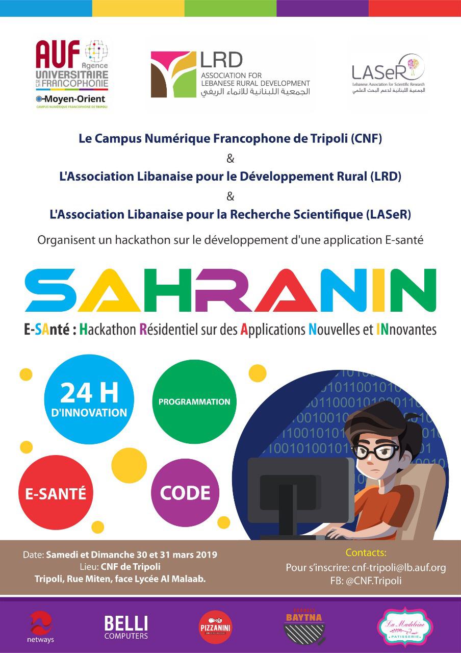 A l’occasion du mois de la Francophonie 2019, le Campus Numérique Francophone de Tripoli de l'AUF, l’Association Libanaise pour le développement Rural, et l'Association Libanaise pour la Recherche Scientifique (LASER) en partenariat avec l’entreprise Netways organisent un hackathon sur l’e-santé dans les locaux du CNF, pour une durée de 24 heures consécutives, les 30 et 31 mars 2019.