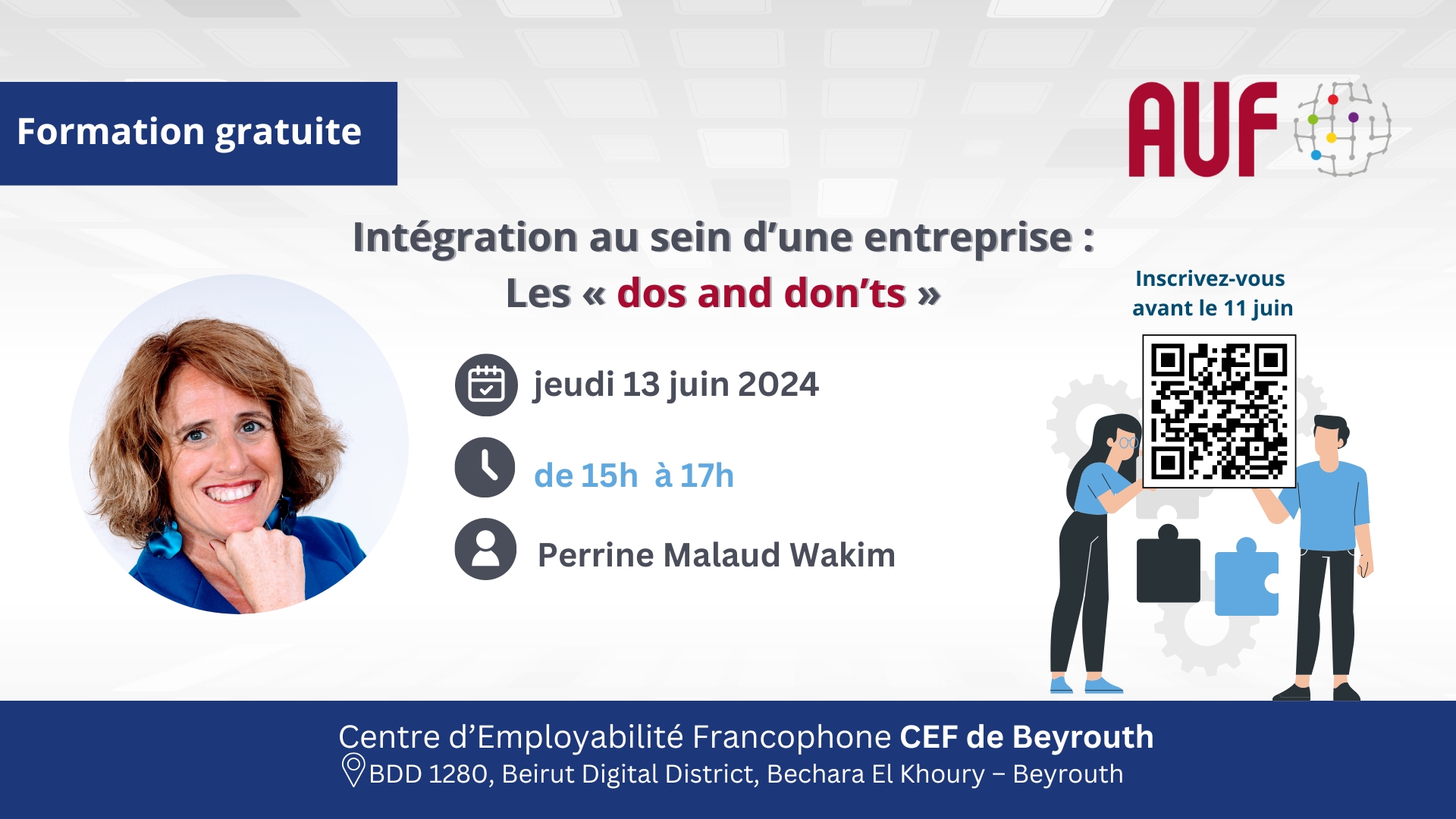L’AUF Moyen-Orient organise une formation intitulée « intégration au sein d’une entreprise : les dos and don’ts », au Centre d'Employabilité Francophone (CEF) de Beyrouth.