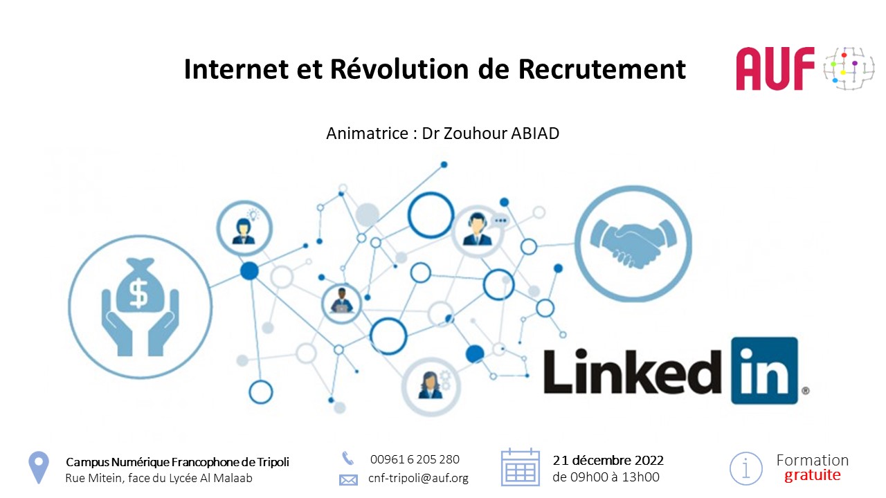 Le Campus Numérique Francophone de Tripoli de l'AUF organise une formation intitulée « Internet et révolution de recrutement » qui vise à acquérir les techniques et méthodes nécessaires pour être efficace et autonome lors d’une recherche d'emploi (TRE), et à se présenter correctement sur les réseaux sociaux (agir et gérer les informations) afin de capter l’attention des recruteurs potentiels.