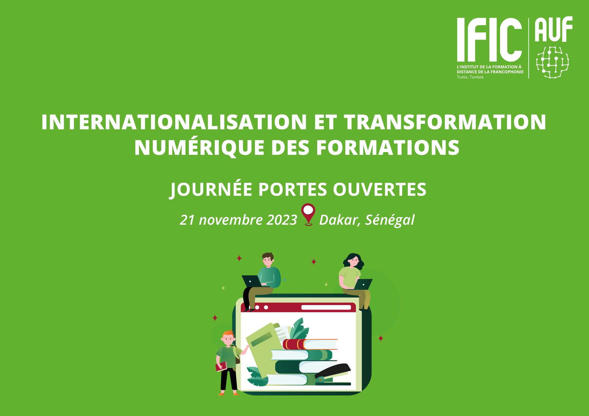 L'Institut de la Formation à Distance de la Francophonie (IFIC), un institut déconcentré de l'Agence universitaire de la Francophonie (AUF), organise une journée portes ouvertes à Dakar, Sénégal, le 21 novembre 2023 dans les locaux du Bureau national de l’AUF au Sénégal, au sein du Campus de l’Université Cheikh Anta Diop.
