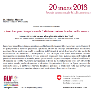 Du 15 au 31 mars 2018, le Groupe des Ambassadeurs Francophones, le Ministère des Affaires étrangères et de la Coopération Internationale, le Ministère de l’Éducation Nationale et l'Agence universitaire organisent plusieurs activités pour célébrer la Fête de la Francophonie au Maroc.