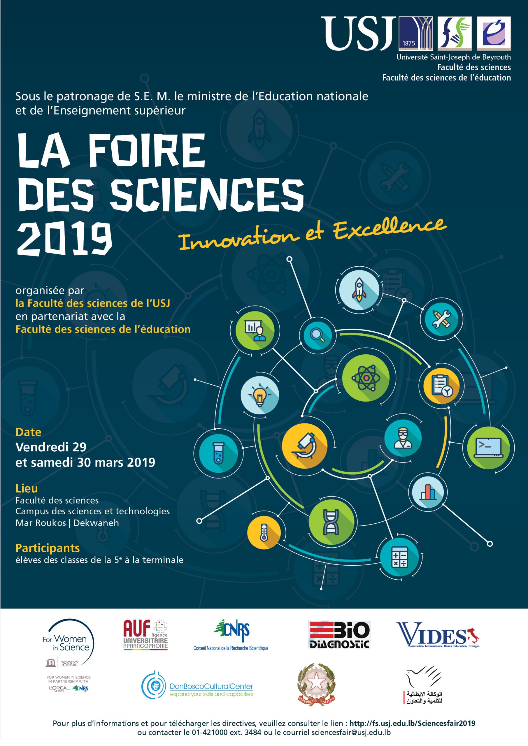 Pour la troisième année consécutive, la Faculté des sciences de l’Université Saint-Joseph (USJ) organise, en partenariat avec la Faculté des sciences de l’éducation, le Conseil National de la Recherche Scientifique Libanais (CNRS-L) et l’Agence Universitaire de la Francophonie, la « Foire des Sciences 2019 » les 29 et 30 mars 2019 sur le Campus des sciences et technologies de l'USJ (Mar Roukos, Dekwaneh).