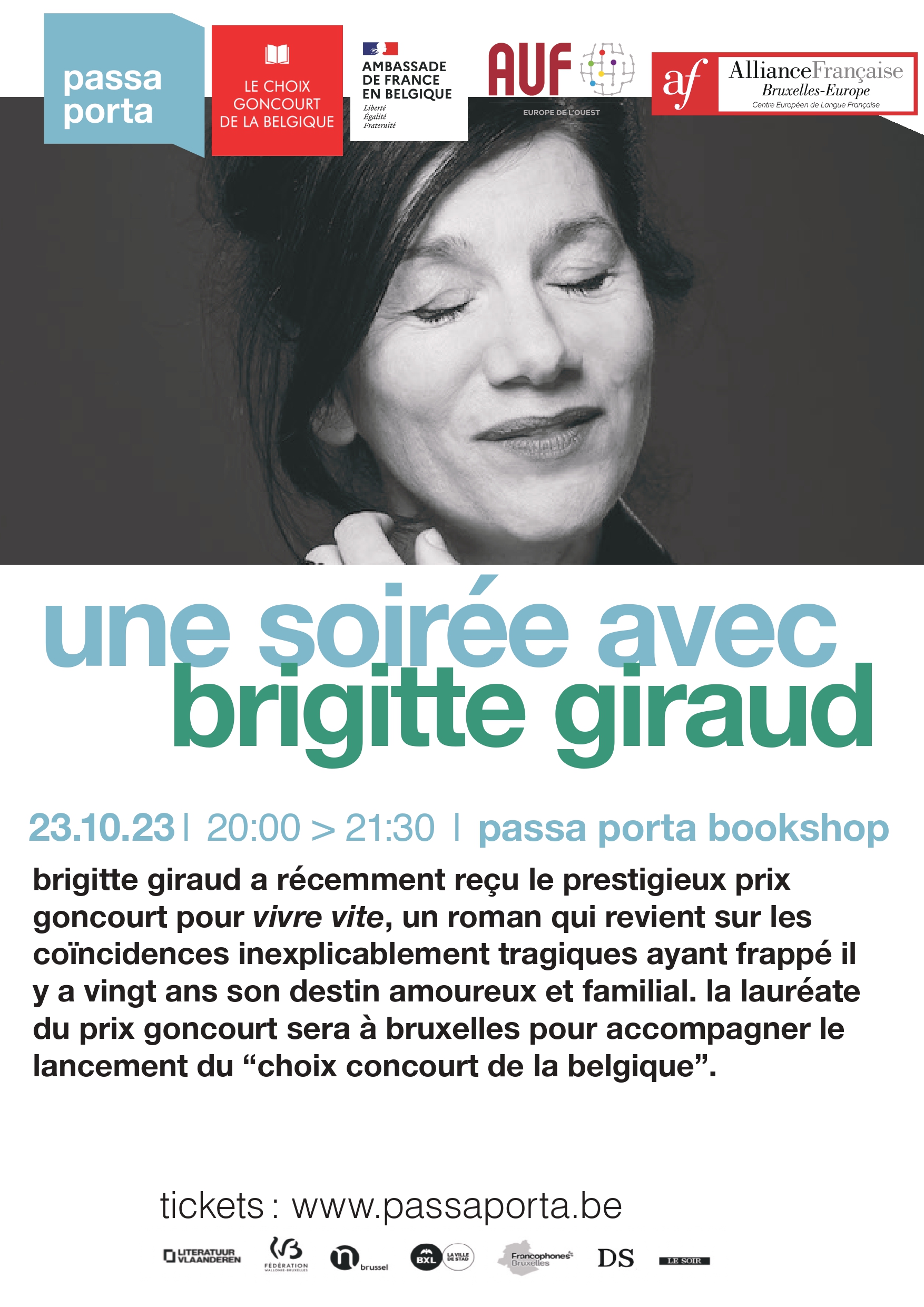 Déjà lauréate de la mention spéciale du prix Wepler, du prix Goncourt de la nouvelle et du prix Jean Giono, Brigitte Giraud* recevait en novembre dernier pour Vivre vite le plus épié des prix littéraires, l’un des plus prescripteurs aussi : le prix Goncourt. Devant un parterre d’étudiantes et d’étudiants futurs jurés du « choix Goncourt de la Belgique », auquel Passa Porta souhaite mêler du public, Brigitte Giraud vient témoigner de ce qu’un prix littéraire change dans la carrière d’une écrivaine. Quels rapports entretient celle qui recevait en 1997 le prix des étudiants pour La Chambre des parents avec des lecteurices d’une nouvelle génération ?