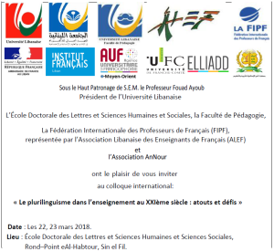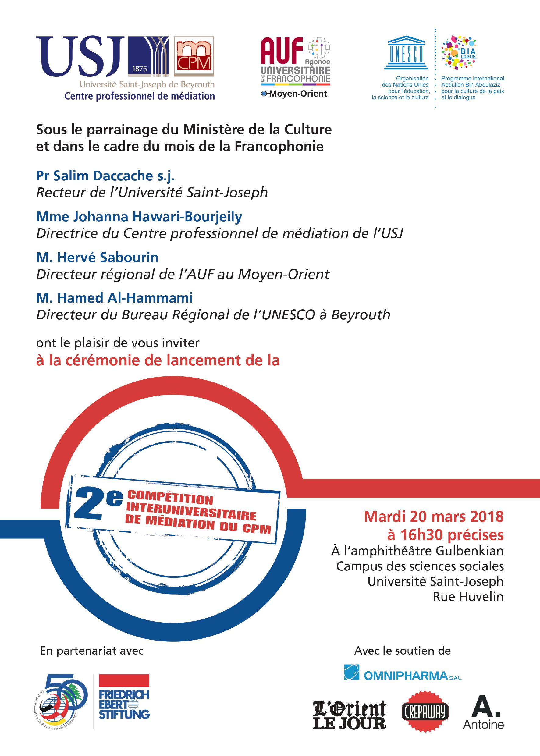 Sous le parrainage du Ministère de la Culture et dans le cadre du mois de la Francophonie, Le Centre Professionnel de Médiation (CPM) de l’Université Saint-Joseph, l’AUF au Moyen-Orient et le Bureau régional de l’UNESCO à Beyrouth, avec le soutien de la Fondation Friedrich Ebert Stiftung, lancent la 2ème compétition interuniversitaire de médiation, le mardi 20 mars à 16h30, à l’amphithéâtre Gulbenkian, Campus des Sciences Sociales, USJ, Rue Huvelin.