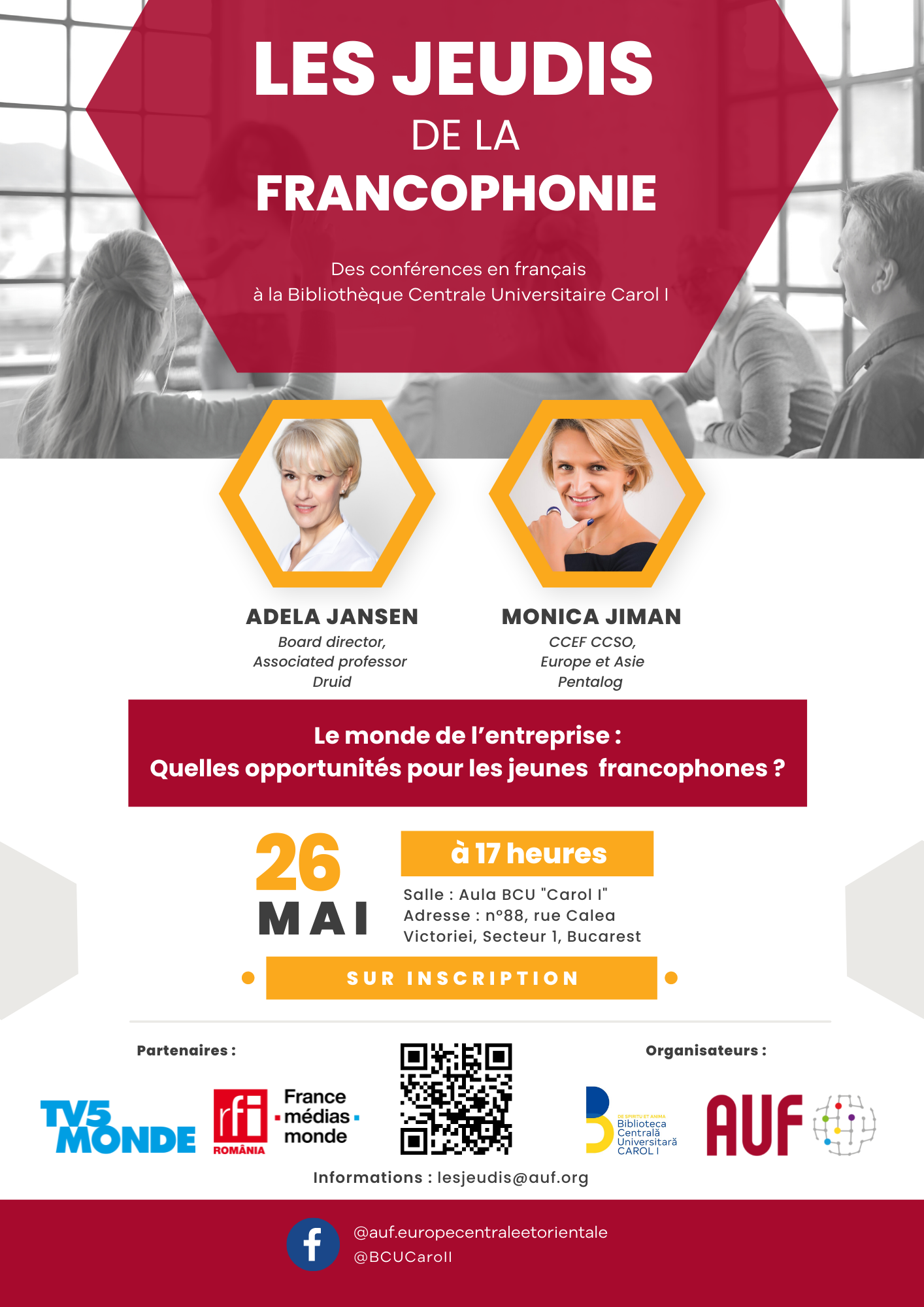 La Direction Europe centrale et orientale de l’Agence universitaire de la Francophonie et la Bibliothèque Centrale Universitaire Carol I lancent un cycle de conférences en français ! Pensées pour les étudiants des filières francophones universitaires, elles sont ouvertes à tous les francophiles.