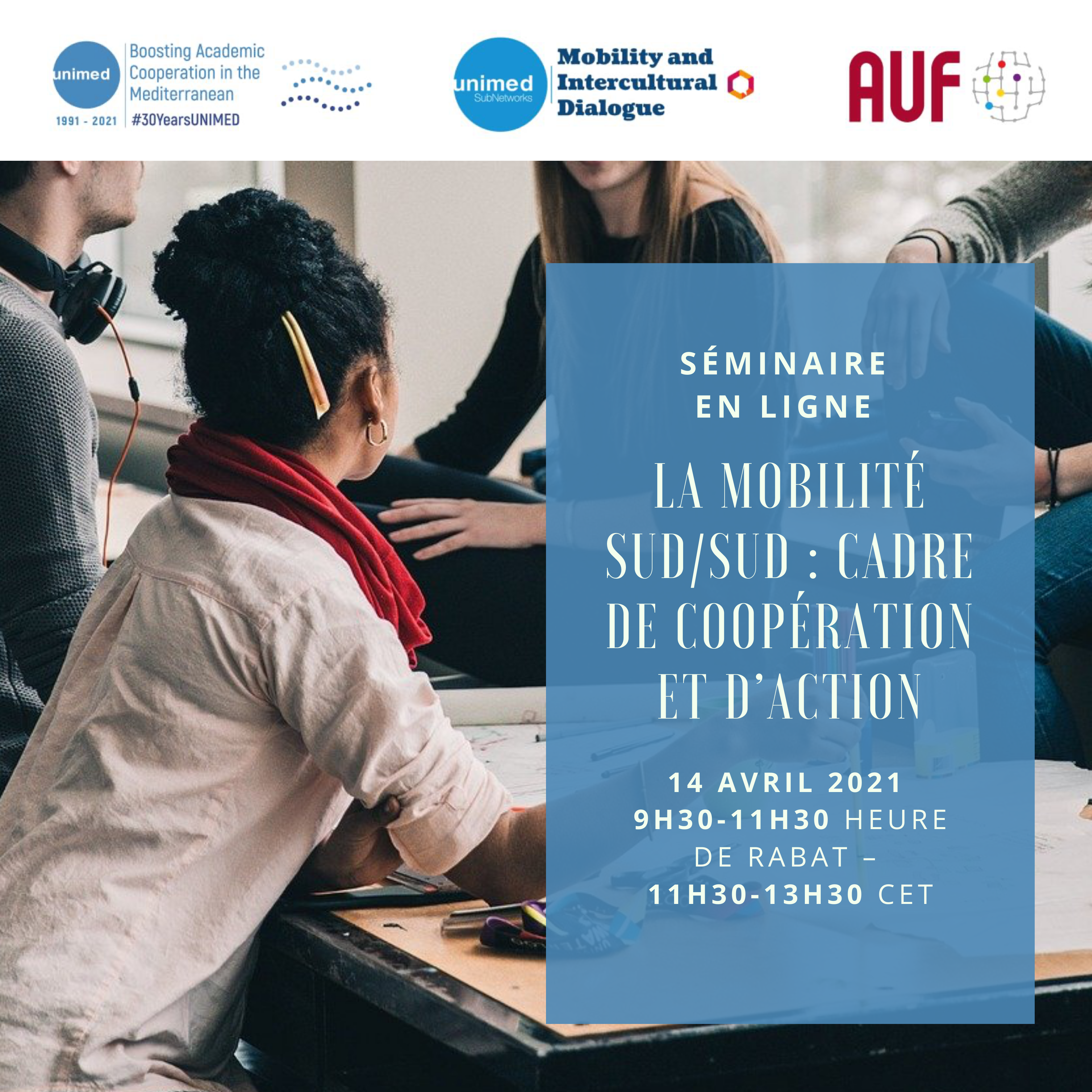 L'AUF Maghreb, représentée par Dr. Danielle Pailler, Directrice régionale et Mme Roxana Turcanu-Tolomey, Directrice régionale adjointe, participera le mardi 14 avril 2021 au Séminaire en ligne sur la Mobilité Sud/Sud : cadre de coopération et d’action organisé par UNIMED - Mediterranean Universities Union et AUF - Maghreb. Inscrivez-vous dès maintenant et rejoignez-nous pour échanger et dialoguer sur ces expériences de mobilités.
