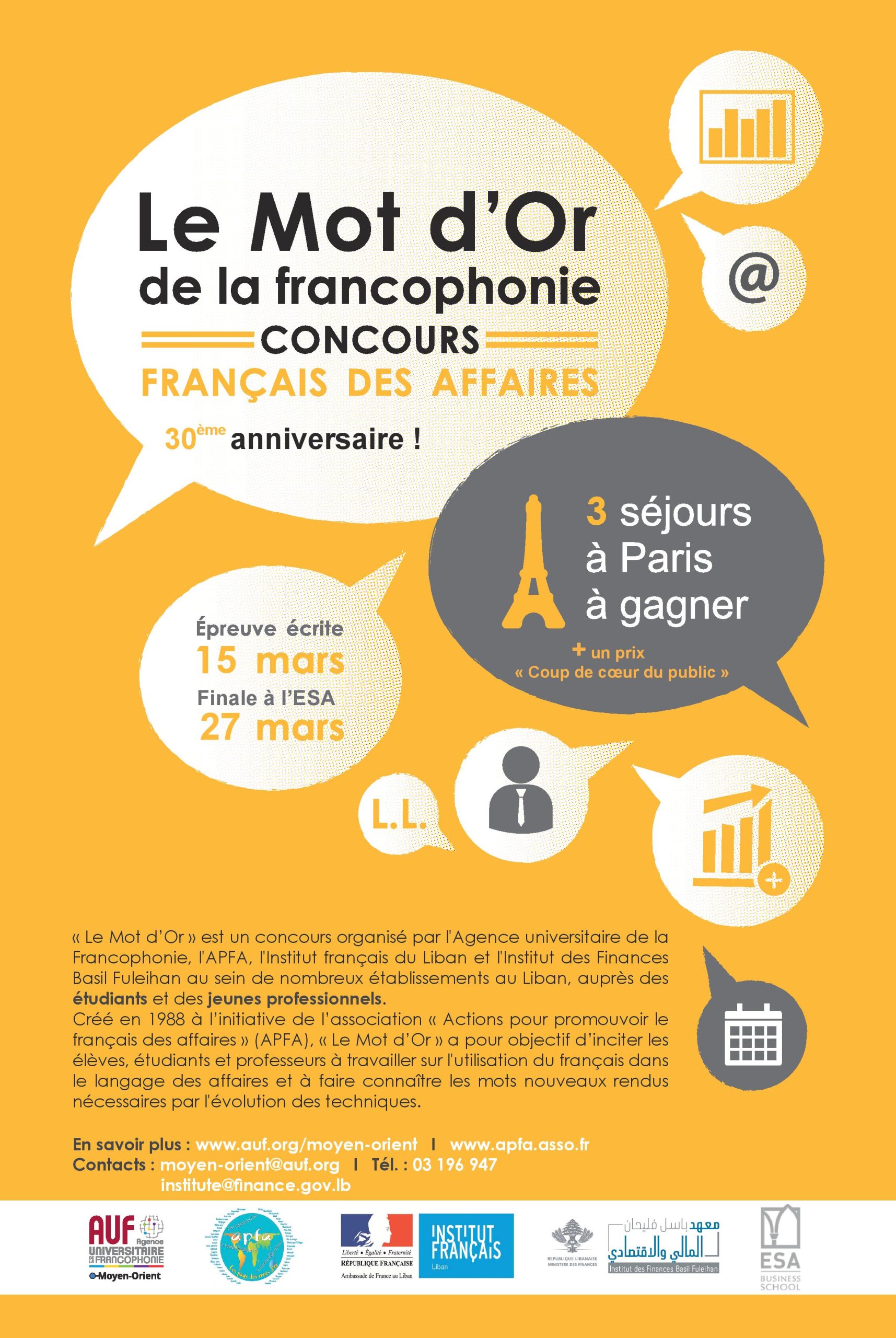 À l’occasion du Mois de la francophonie au Liban, en partenariat avec l’Institut français du Liban, et l’Institut des Finances Basil Fuleihan, l’association Actions pour promouvoir le français des affaires (APFA) et la Direction régionale Moyen-Orient de l’Agence Universitaire de la Francophonie organisent la cérémonie de remise des Prix « Le Mot d’Or de la francophonie 2018 » (Étudiants et Jeunes Professionnels), le mardi 27 mars 2018 à 18h00, à l’auditorium Fattal de l’Ecole Supérieure des Affaires (ESA), rue Clémenceau, Beyrouth
