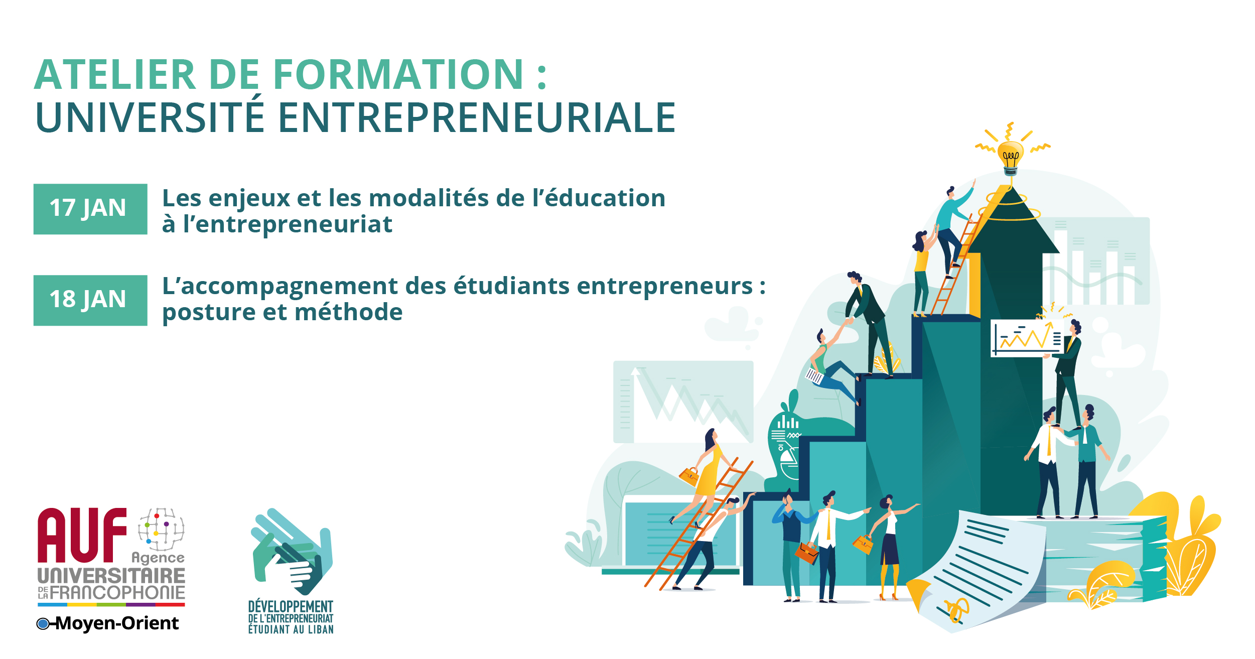 La Direction Régionale Moyen-Orient de l'AUF organise un atelier de formation destiné aux enseignants des universités partenaires du projet DEEL (Développement de l’entrepreneuriat étudiant au Liban). Le but est de permettre aux universités de définir les enjeux d’une université entrepreneuriale en termes d’éducation, d’insertion professionnelle et de valorisation de la recherche, ainsi que de développer les outils de l’entrepreneuriat utiles à l’accompagnement des étudiants entrepreneurs.