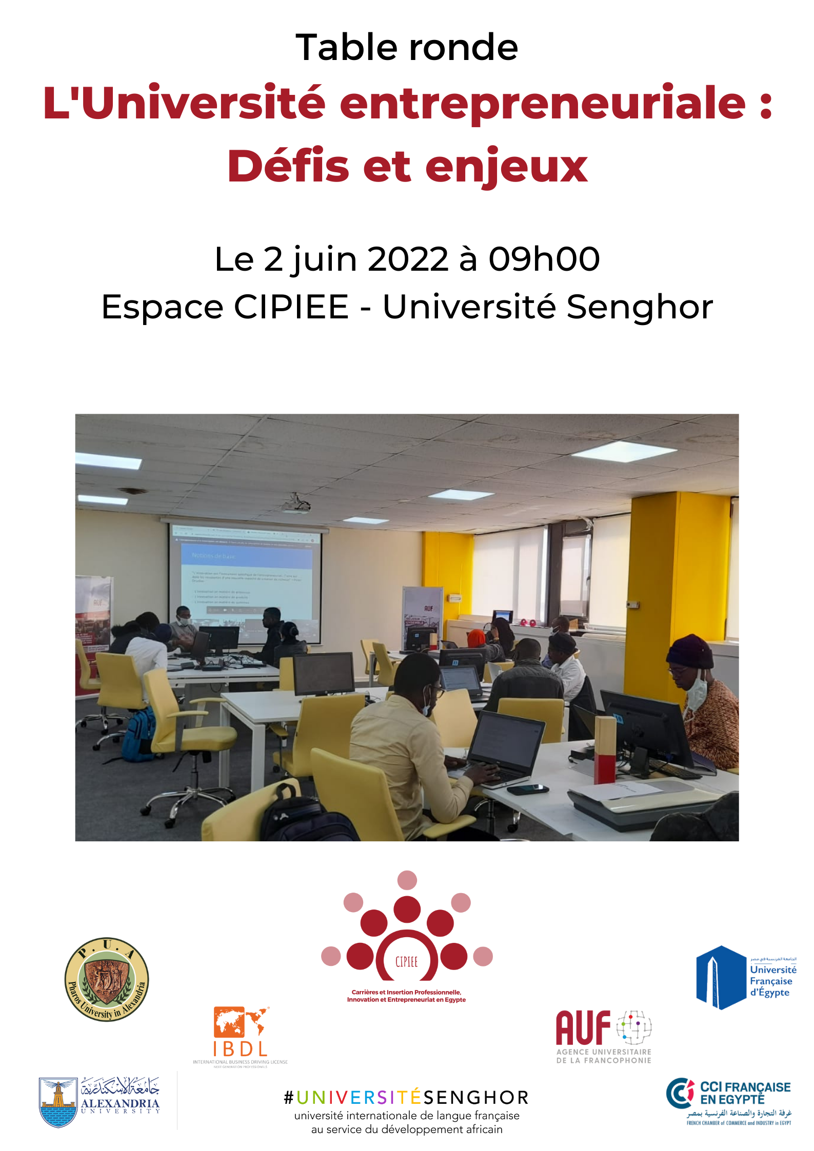 Dans le cadre du projet CIPIEE (Carrières et Insertion Professionnelle, Innovation et Entrepreneuriat en Égypte), l'AUF et l'Université Senghor organisent une table ronde sur « L’Université entrepreneuriale : défis et enjeux », le 2 juin 2022.