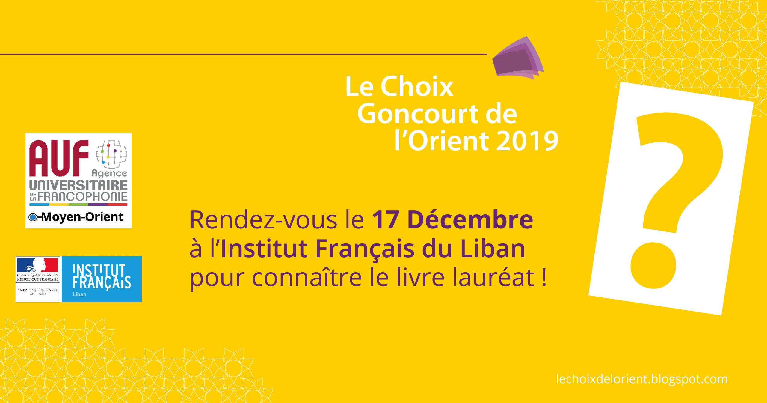 L'AUF Moyen-Orient et l’Institut français du Liban organisent la 8ème édition du Prix littéraire francophone régional « Le Choix Goncourt de l'Orient » à l'Institut Francais du Liban, rue de Damas. La délibération et la proclamation se feront le mardi 17 décembre 2019.