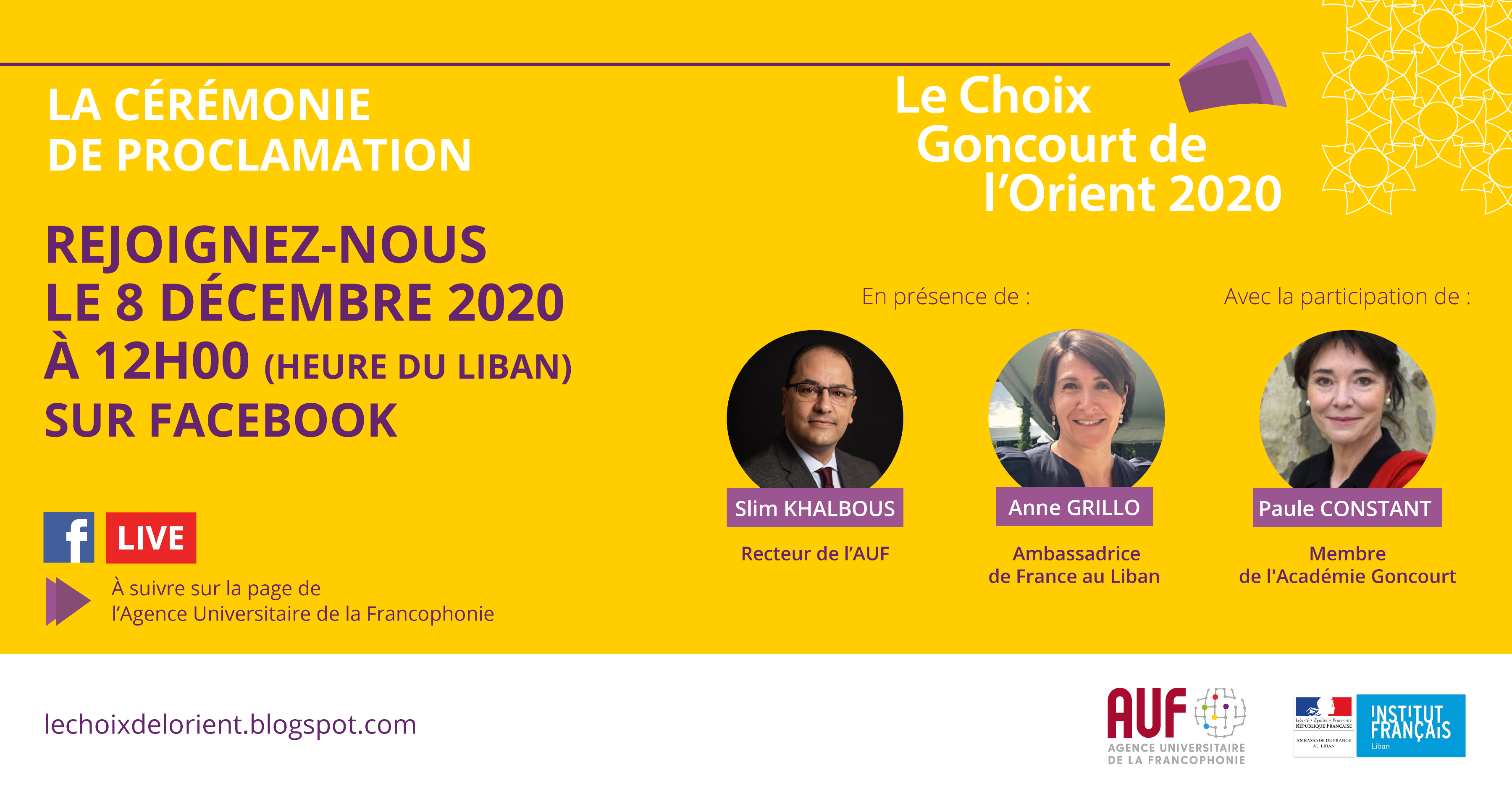 La cérémonie de proclamation du Choix Goncourt de l’Orient 2020 se tiendra en format hybride le mardi 8 décembre à 12h (heure du Liban), à l’Institut français du Liban, salle Montaigne.