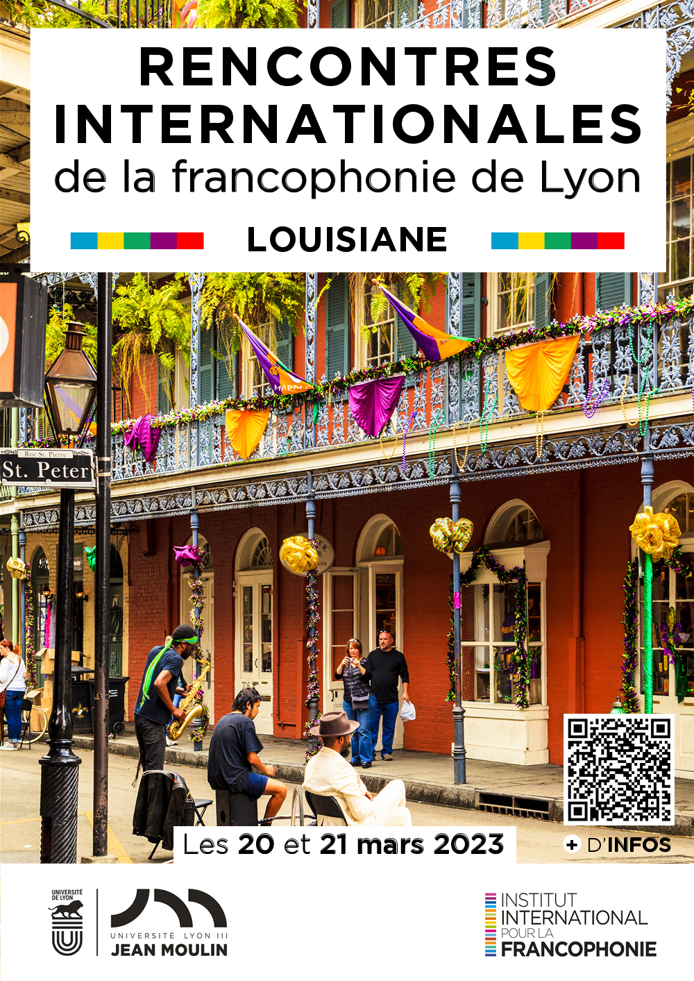 Dans le cadre du mois de la Francophonie, le Service Général des Relations Internationales de l’Université Jean Moulin Lyon 3 et l’Institut international pour la Francophonie vous invitent à célébrer la Francophonie les 20 et 21 mars 2023. Cette année, la Louisiane est à l'honneur !